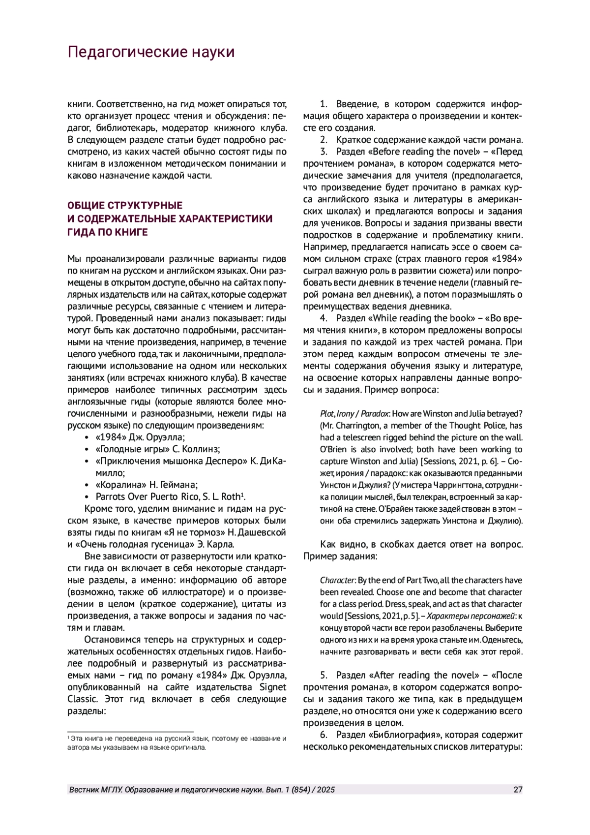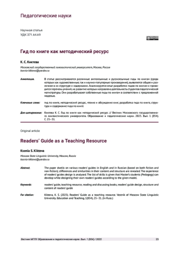 В статье рассматриваются различные англоязычные и русскоязычные гиды по книгам (среди которых как художественные, так и научно-популярные произведения), выявляется общее и различное в их структуре и содержании. Анализируется опыт разработки гидов по книгам и приводится перечень умений, на развитие которых направлена деятельность студентов педагогической магистратуры. Они разрабатывают собственные гиды по книгам в соответствии с предложенной моделью.