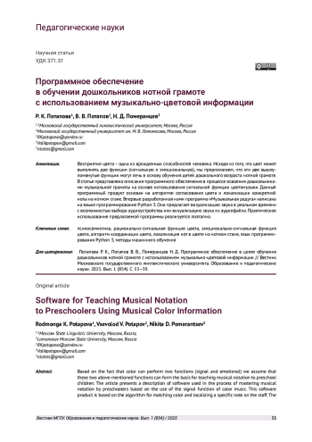Цвет и звук исходно предметы семиотики. Ранее нами была представлена концепция исследования речи и музыки на основе семиотики [Потапова, Пота пов, 2018; Potapova, Potapov, 2019]. В рамках педагогического подхода к феноменам цвета и звука вышеозначенная концепция имеет практическое значение. Она способствует эффективному обучению нотной грамоте и может успешно актуализироваться с использованием музыкально-цветовой информации. Таким образом, еще раз подтверждается наличие хорошо «работающей» психосемиотической системы. Она функционирует на зрительном и слуховом уровне, которые непосредственно связаны с различными психофизиологическими анализаторами человека.
