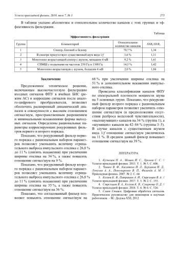 Проведена классификация каналов ФПУ по спектральной плотности мощности шума на 5 основных групп. Показано, что рекурсивный фильтр второго порядка с рациональным набором параметров позволяет увеличить отношение сигнал/шум (в предположении отсутствия разброса вольтовой чувствительности), «малошумящих» каналов на 34 % (группа 1), а «шумящих» каналов на 42–84 % (группы 3–5). В случае каналов с существенным шумом вида 1/f отношение сигнал/шум увеличилось на 11 %. В среднем данный фильтр повышает отношение сигнал/шум на 39 %.