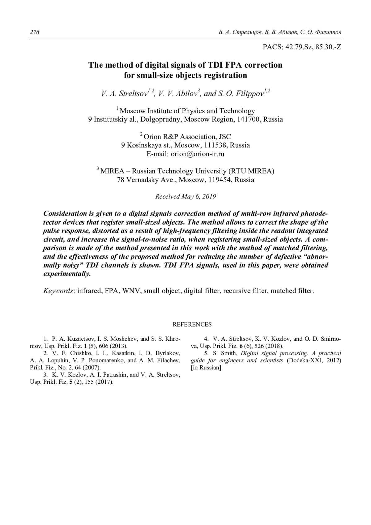 В работе предложен метод цифровой коррекции выходных сигналов многорядных инфракрасных (ИК) фотоприемных устройств (ФПУ), осуществляющих регистрацию малоразмерных объектов. Метод позволяет скорректировать форму импульсного отклика, искаженного в результате высокочастотной фильтрации внутри ФПУ, и повысить отношение сигнал/шум. Проведено сравнение метода, представленного в данной работе с методом согласованной фильтрации, и показана эффективность предложенного метода для уменьшения числа дефектных «аномально шумящих» каналов ФПУ. Исходными данными для расчетов служат изображения, полученные в результате стендовых испытаний ФПУ в режиме регистрации малоразмерного объекта при сканировании.