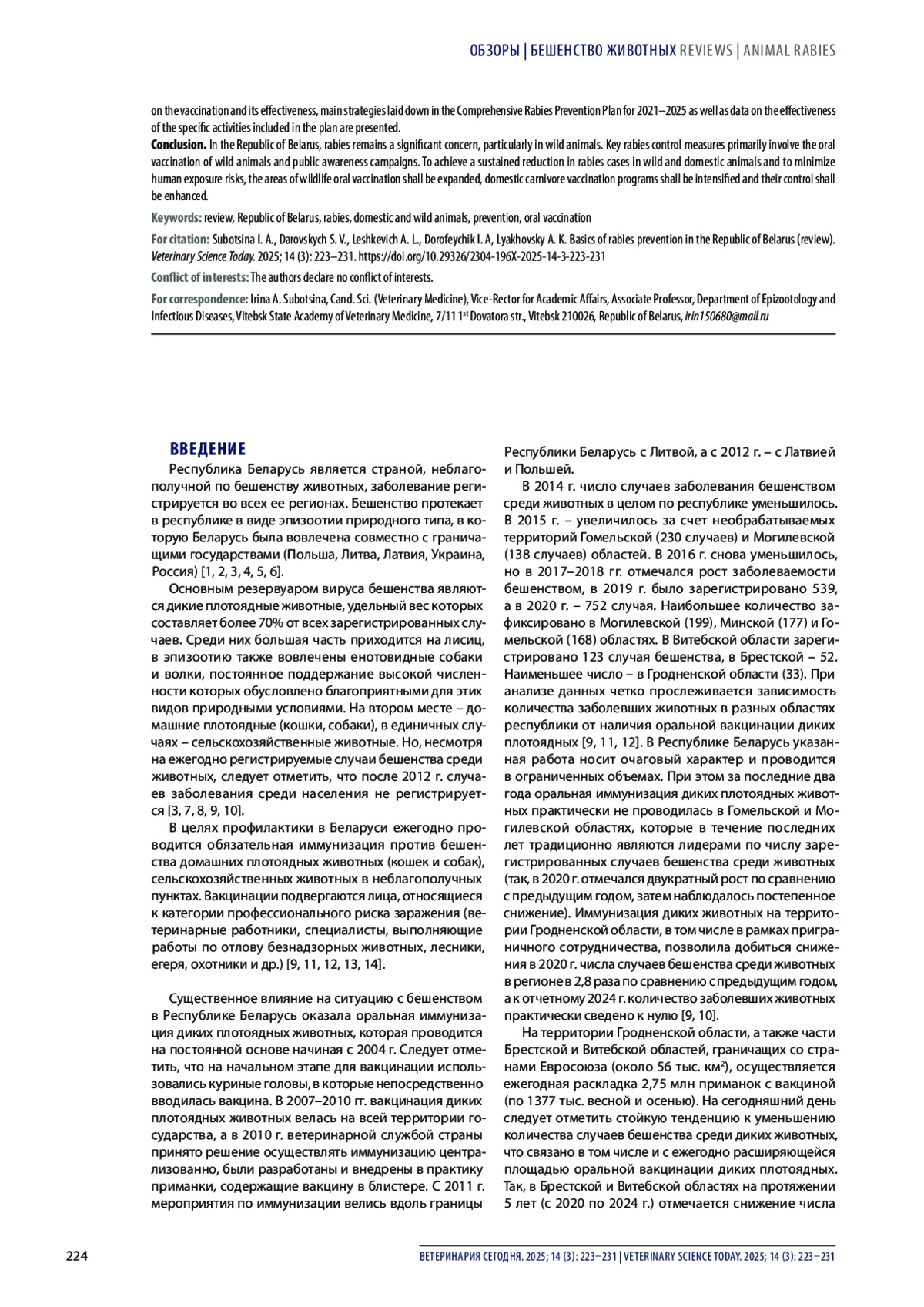 Республика Беларусь является страной, неблагополучной по бешенству животных, заболевание регистрируется во всех ее регионах. Бешенство протекает в республике в виде эпизоотии природного типа, в которую Беларусь была вовлечена совместно с граничащими государствами (Польша, Литва, Латвия, Украина, Россия) [1, 2, 3, 4, 5, 6].