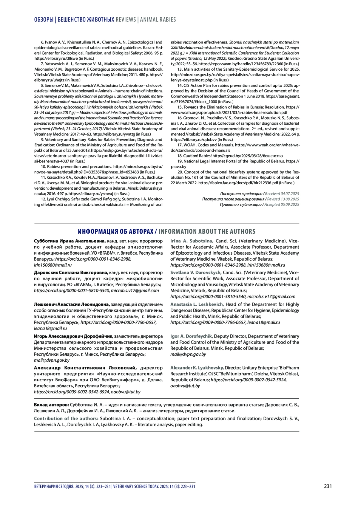 1. Бабак В. А., Гусев А. А. Бешенство диких животных в Беларуси. Экология и инновации: материалы VII Международной научно-практической конференции (г. Витебск, 22-23 мая 2008 г.). Витебск: ВГАВМ; 2008; 15-16. https://repo.vsavm.by/handle/123456789/15959.