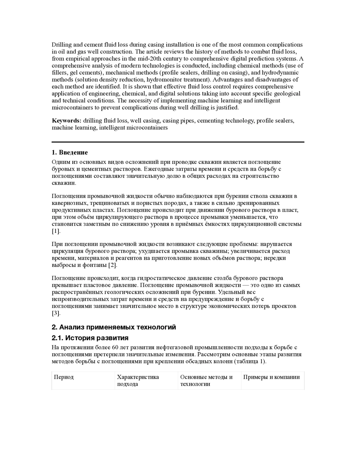 В статье рассматривается проблема поглощения бурового раствора при креплении обсадных колонн в условиях осложнённого разреза. Приведён анализ распространённых причин возникновения поглощений и их влияния на качество цементирования и надёжность крепи скважины. Оценены возможности применения традиционных и специальных тампонажных материалов, а также технологических приёмов по снижению потерь раствора в поглощающих интервалах. Предложены направления совершенствования технологии крепления обсадных колонн, позволяющие повысить герметичность заколонного пространства и снизить риск дальнейших осложнений в процессе строительства и эксплуатации скважин