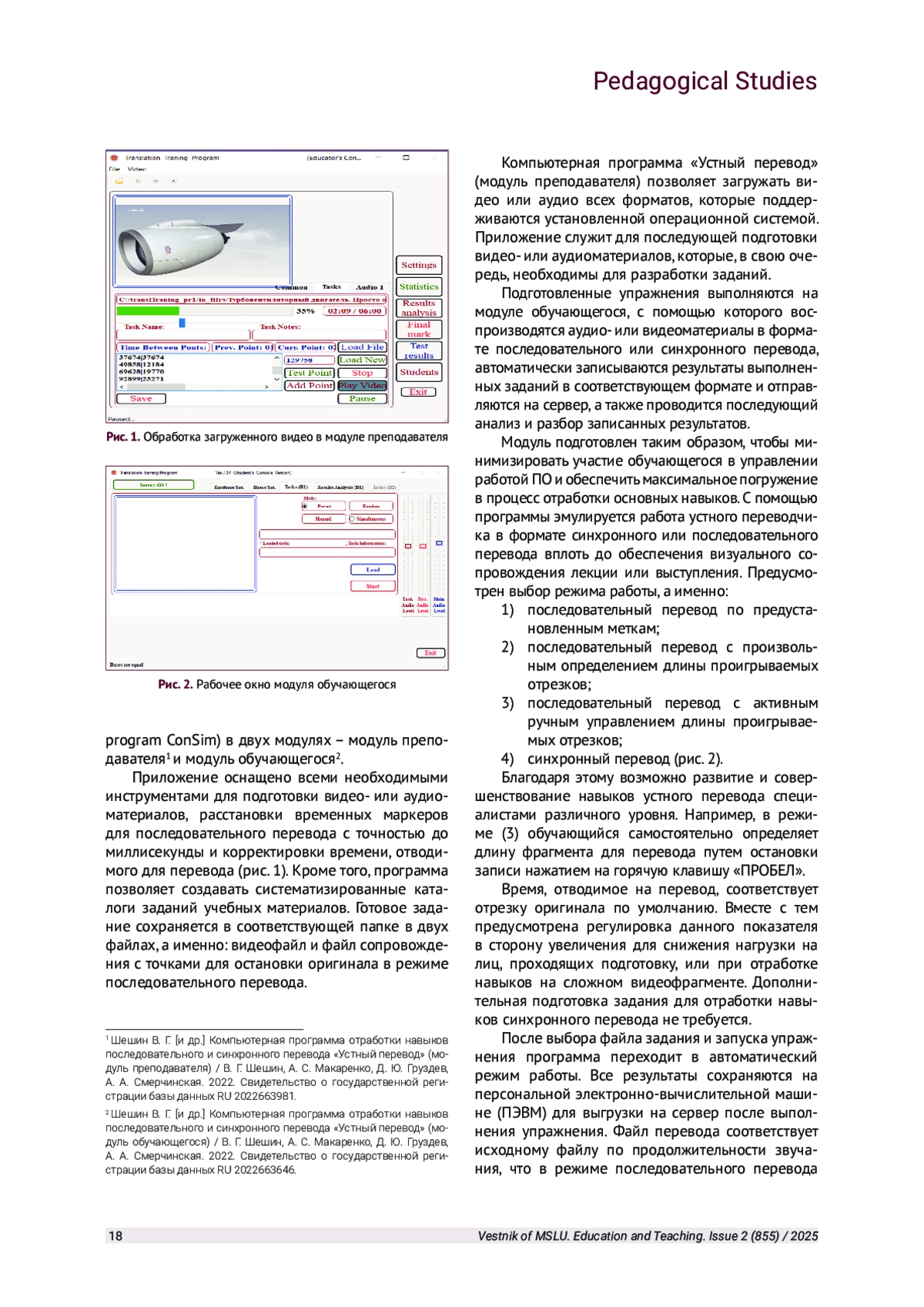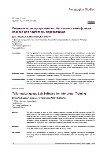 ГРУЗДЕВ Д. Ю., МАКАРЕНКО А. С., ШЕШИН В. Г. СПЕЦИАЛИЗАЦИЯ ПРОГРАММНОГО ОБЕСПЕЧЕНИЯ ЛИНГАФОННЫХ КЛАССОВ ДЛЯ ПОДГОТОВКИ ПЕРЕВОДЧИКОВ // ВЕСТНИК МОСКОВСКОГО ГОСУДАРСТВЕННОГО ЛИНГВИСТИЧЕСКОГО УНИВЕРСИТЕТА. ОБРАЗОВАНИЕ И ПЕДАГОГИЧЕСКИЕ НАУКИ. 2025. № 2 (855)