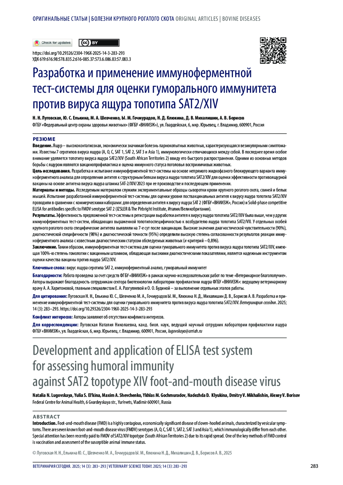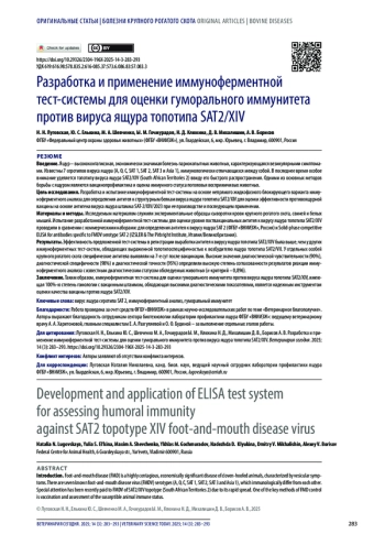 Введение. Ящур – высококонтагиозная, экономически значимая болезнь парнокопытных животных, характеризующаяся везикулярными симптомами. Известны 7 серотипов вируса ящура (A, O, C, SAT 1, SAT 2, SAT 3 и Asia 1), иммунологически отличающихся между собой. В последнее время особое внимание уделяется топотипу вируса ящура SAT2/XIV (South African Territories 2) ввиду его быстрого распространения. Одними из основных методов борьбы с ящуром являются вакцинопрофилактика и оценка иммунного статуса поголовья восприимчивых животных.