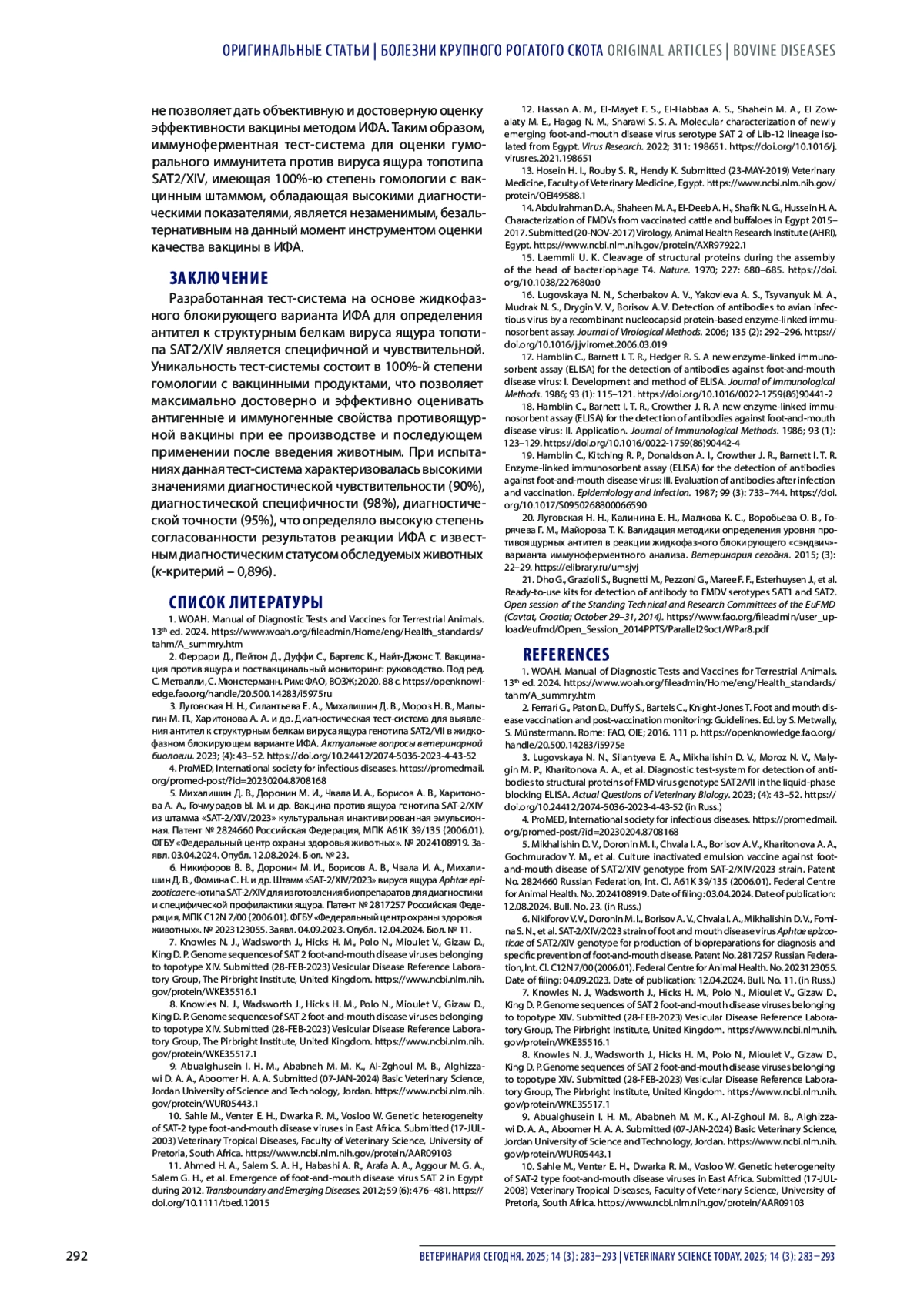 3. Луговская Н. Н., Силантьева Е. А., Михалишин Д. В., Мороз Н. В., Малыгин М. П., Харитонова А. А. и др. Диагностическая тест-система для выявления антител к структурным белкам вируса ящура генотипа SAT2/VII в жидкофазном блокирующем варианте ИФА. Актуальные вопросы ветеринарной биологии. 2023; (4): 43-52. DOI: 10.24412/2074-5036-2023-4-43-52