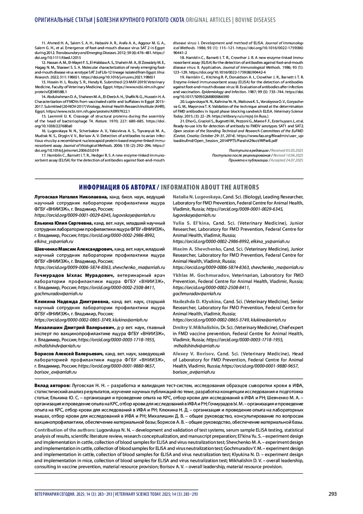 19. Hamblin C., Kitching R. P., Donaldson A. I., Crowther J. R., Barnett I. T. R. Enzymelinked immunosorbent assay (ELISA) for the detection of antibodies against foot-and-mouth disease virus: III. Evaluation of antibodies after infection and vaccination. Epidemiology and Infection. 1987; 99 (3): 733-744. DOI: 10.1017/S0950268800066590