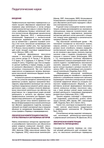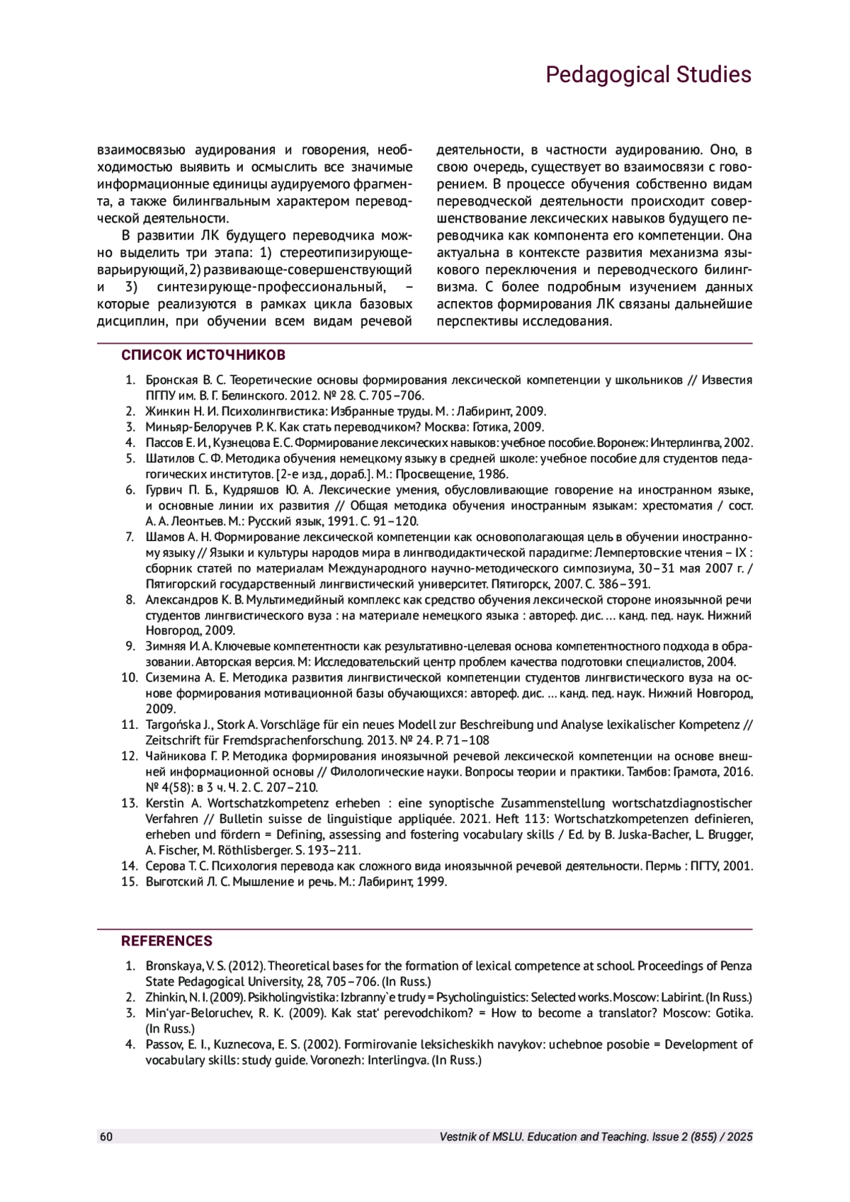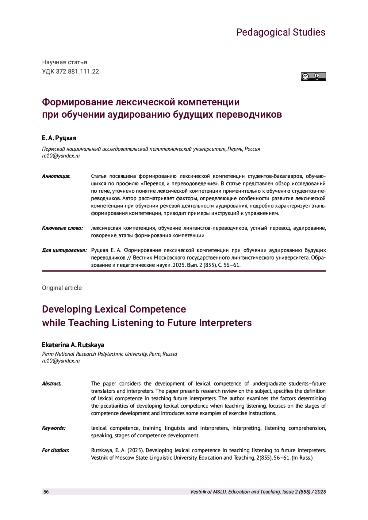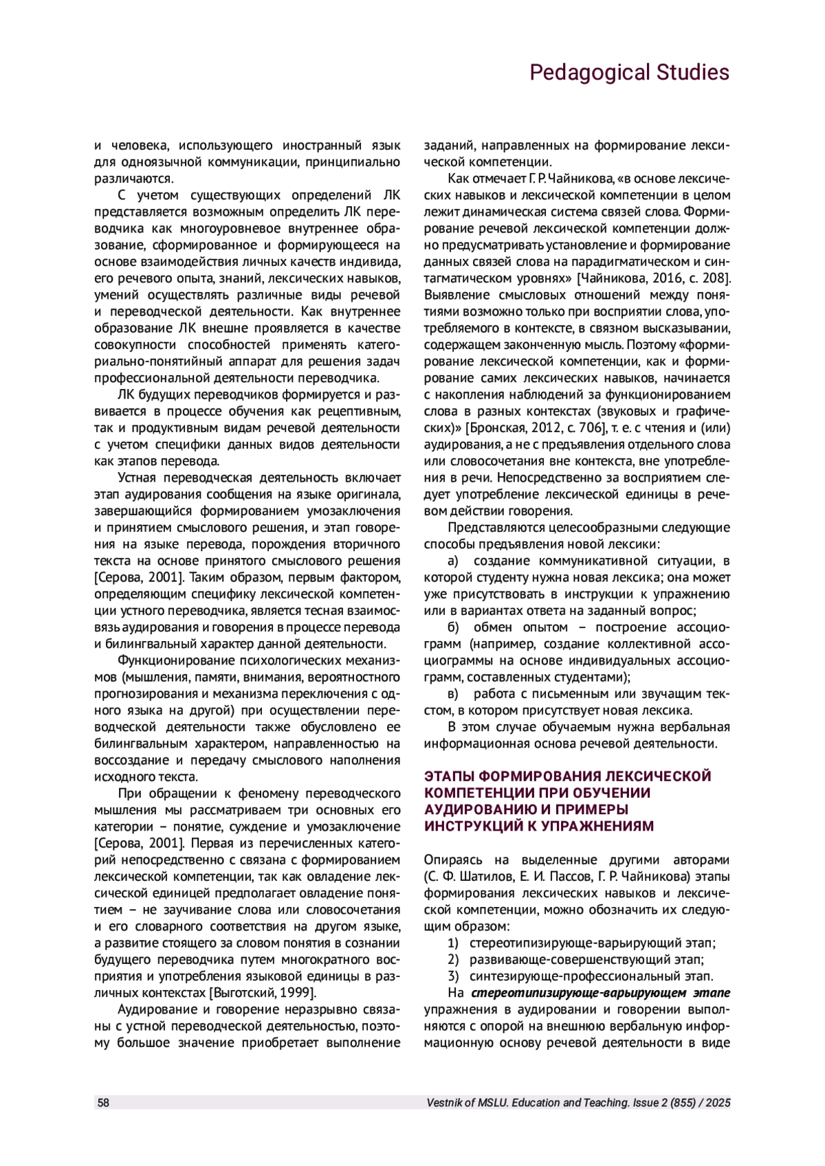 РУЦКАЯ Е. А. ФОРМИРОВАНИЕ ЛЕКСИЧЕСКОЙ КОМПЕТЕНЦИИ ПРИ ОБУЧЕНИИ АУДИРОВАНИЮ БУДУЩИХ ПЕРЕВОДЧИКОВ // ВЕСТНИК МОСКОВСКОГО ГОСУДАРСТВЕННОГО ЛИНГВИСТИЧЕСКОГО УНИВЕРСИТЕТА. ОБРАЗОВАНИЕ И ПЕДАГОГИЧЕСКИЕ НАУКИ. 2025. № 2 (855)