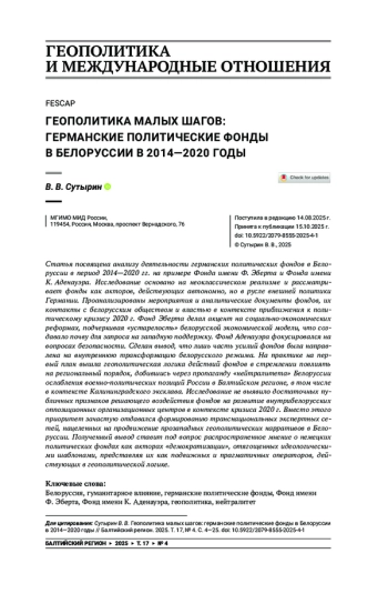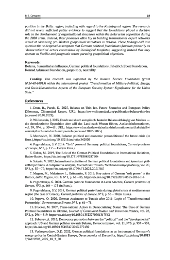 Статья посвящена анализу деятельности германских политических фондов в Белоруссии в период 2014—2020 гг. на примере Фонда имени Ф. Эберта и Фонда имени К. Аденауэра. Исследование основано на неоклассическом реализме и рассматривает фонды как акторов, действующих автономно, но в русле внешней политики Германии. Проанализированы мероприятия и аналитические документы фондов, их контакты с белорусским обществом и властью в контексте приближения к политическому кризису 2020 г. Фонд Эберта делал акцент на социально-экономических реформах, подчеркивая «устарелость» белорусской экономической модели, что создавало почву для запроса на западную поддержку. Фонд Аденауэра фокусировался на вопросах безопасности. Сделан вывод, что лишь часть усилий фондов была направлена на внутреннюю трансформацию белорусского режима. На практике на первый план вышла геополитическая логика действий фондов в стремлении повлиять на региональный порядок, добившись через пропаганду «нейтралитета» Белоруссии ослабления военно-политических позиций России в Балтийском регионе, в том числе в контексте Калининградского эксклава. Исследование не выявило достаточных публичных признаков решающего воздействия фондов на развитие внутрибелорусских оппозиционных организационных центров в контексте кризиса 2020 г. Вместо этого приоритет зачастую отдавался формированию транснациональных экспертных сетей, нацеленных на продвижение прозападных геополитических нарративов в Белоруссии. Полученный вывод ставит под вопрос распространенное мнение о немецких политических фондах как акторах «демократизации», отягощенных идеологическими шаблонами, представляя их как подвижных и прагматичных операторов, действующих в геополитической логике.
