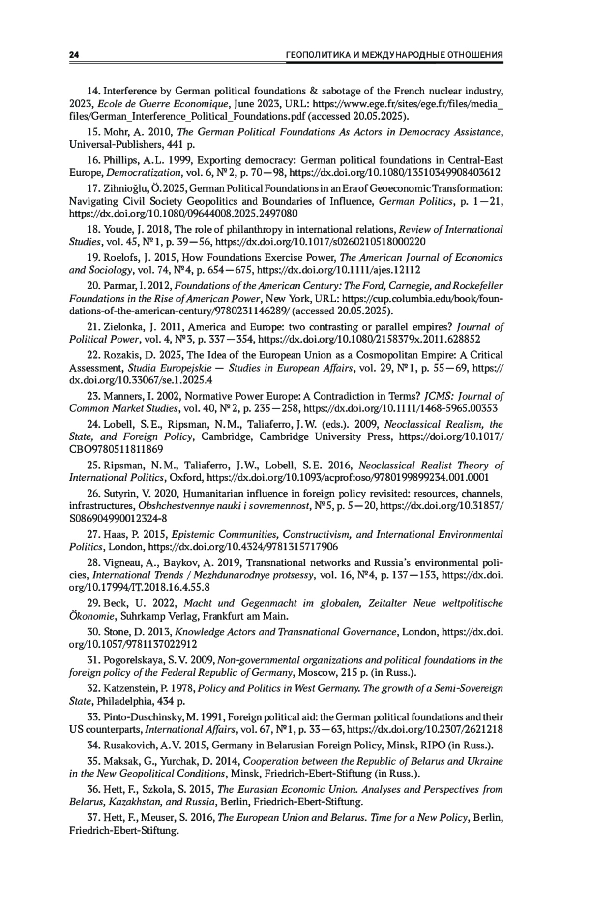 6. Сутырин, В. В. 2022, Финансы для либерального порядка. Cравнительный анализ международной деятельности политических фондов ФРГ и филантропических фондов США, Международные процессы, т. 20, No 3, с. 55—79, EDN: DIIOHV, https://doi.org/10.17994/