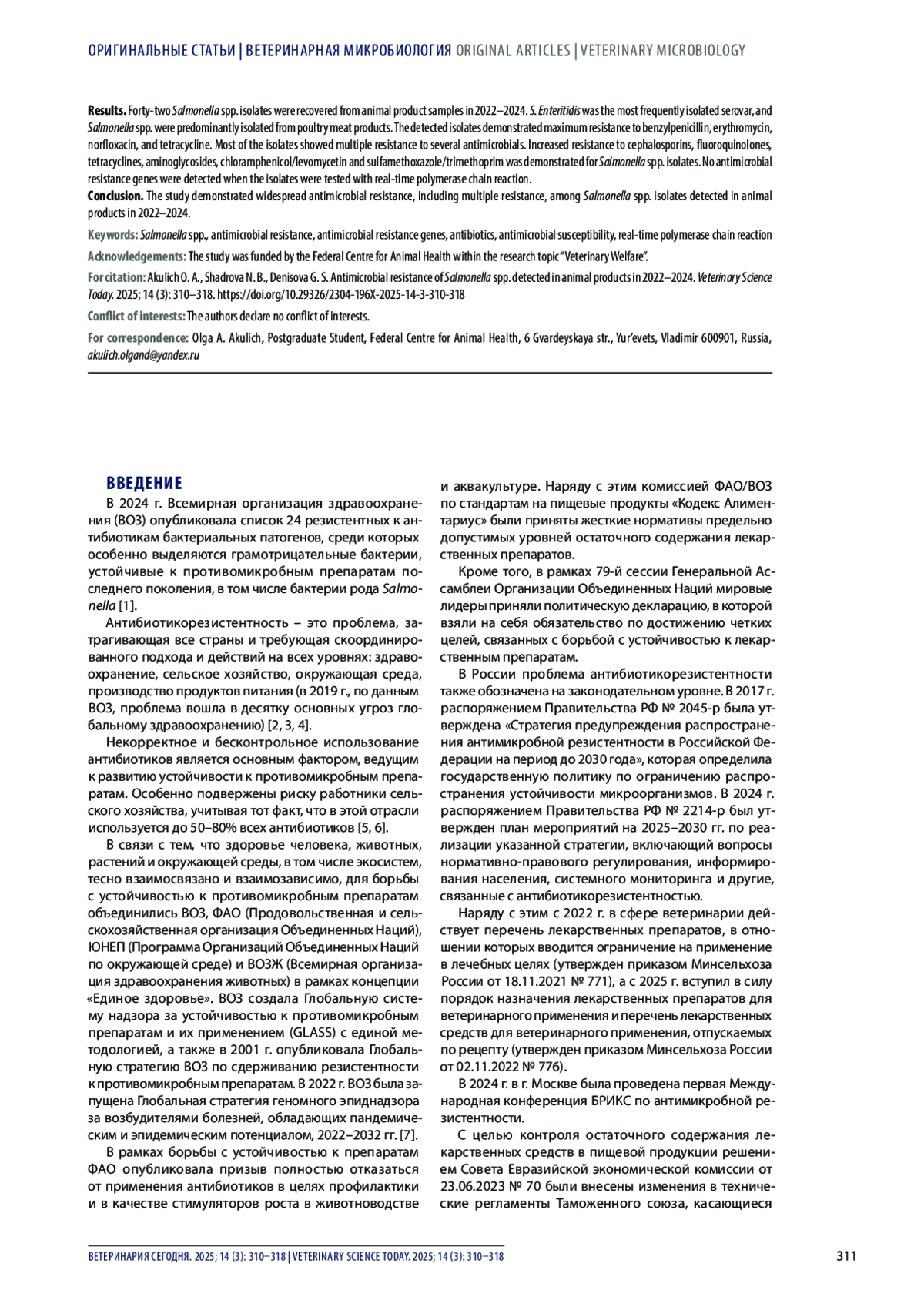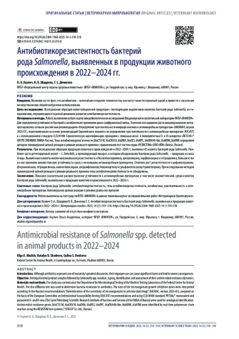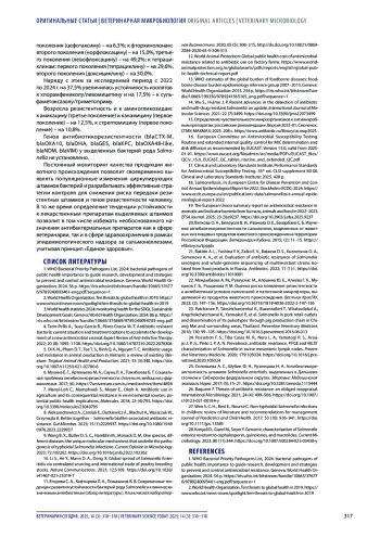 Заключение. Показано значительное распространение устойчивости к антимикробным препаратам, в том числе множественной, среди изолятов бактерий рода Salmonella, выявленных в продукции животного происхождения в 2022–2024 гг.