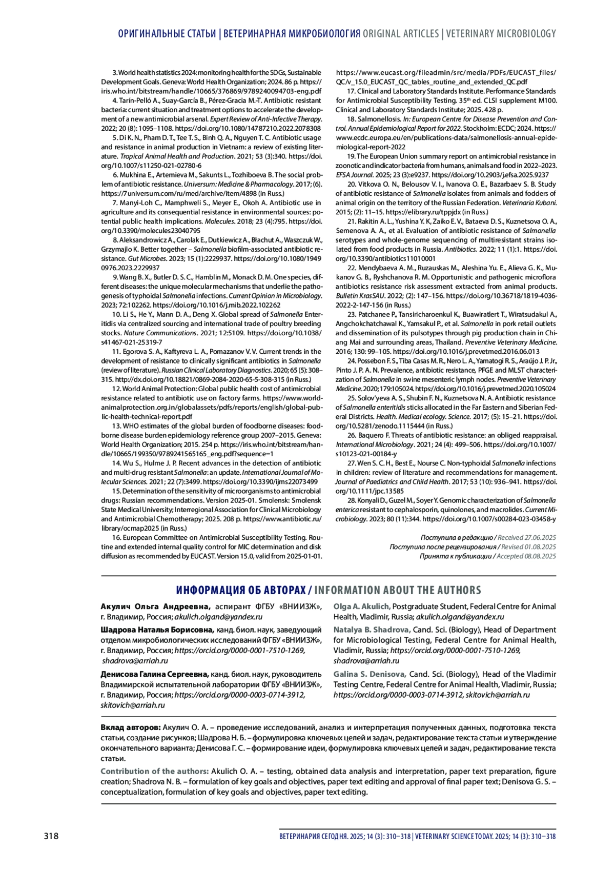 21. Rakitin A. L., Yushina Y. K, Zaiko E. V., Bataeva D. S., Kuznetsova O. A., Semenova A. A., et al. Evaluation of antibiotic resistance of Salmonella serotypes and whole-genome sequencing of multiresistant strains isolated from food products in Russia. Antibiotics. 2022; 11 (1):1. DOI: 10.3390/antibiotics11010001
