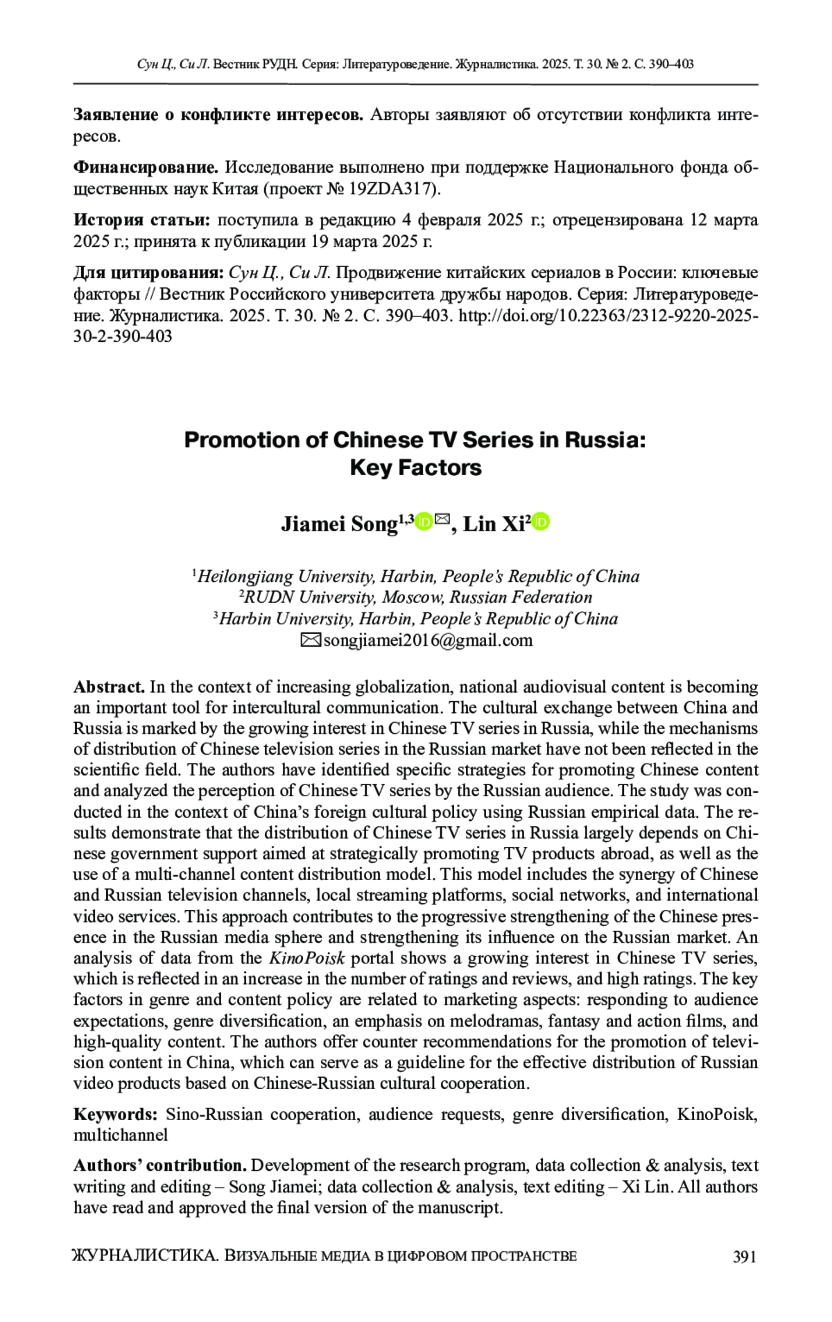 В условиях усиливающейся глобализации национальный аудиовизуальный контент становится важным инструментом межкультурной коммуникации. Культурный обмен между Китаем и Россией отмечен нарастающим интересом к китайским сериалам, при этом в научном поле не отрефлексированы механизмы их распространения на российском рынке. Авторами выявлены конкретные стратегии продвижения китайского контента, проанализированы особенности восприятия китайских сериалов российской аудиторией. Исследование проведено в контексте внешней культурной политики Китая с привлечением российских эмпирических данных. Результаты демонстрируют, что распространение китайских сериалов в России во многом зависит от государственной поддержки КНР, направленной на стратегическое продвижение телепродуктов за рубеж, а также от использования мультиканальной модели распространения контента, включающей синергию китайских и российских телевизионных каналов, локальных стриминговых платформ, социальных сетей и международных видеосервисов. Такой подход способствует поступательному укреплению китайского присутствия в российской медиасфере и усилению влияния на российском рынке. Анализ данных с портала «КиноПоиск» показывает растущий интерес к китайским сериалам, что выражается в увеличении числа оценок и рецензий, высоких рейтингах. Ключевые факторы в жанрово-содержательной политике связаны с маркетинговыми аспектами: ответ на зрительские ожидания, диверсификация жанров, акцент на мелодрамах, фэнтези и боевиках, высокое качество контента. Авторы предлагают встречные рекомендации для продвижения телевизионного контента в Китае, которые могут послужить ориентиром для эффективного распространения российской видеопродукции с опорой на китайско-российское культурное сотрудничество.