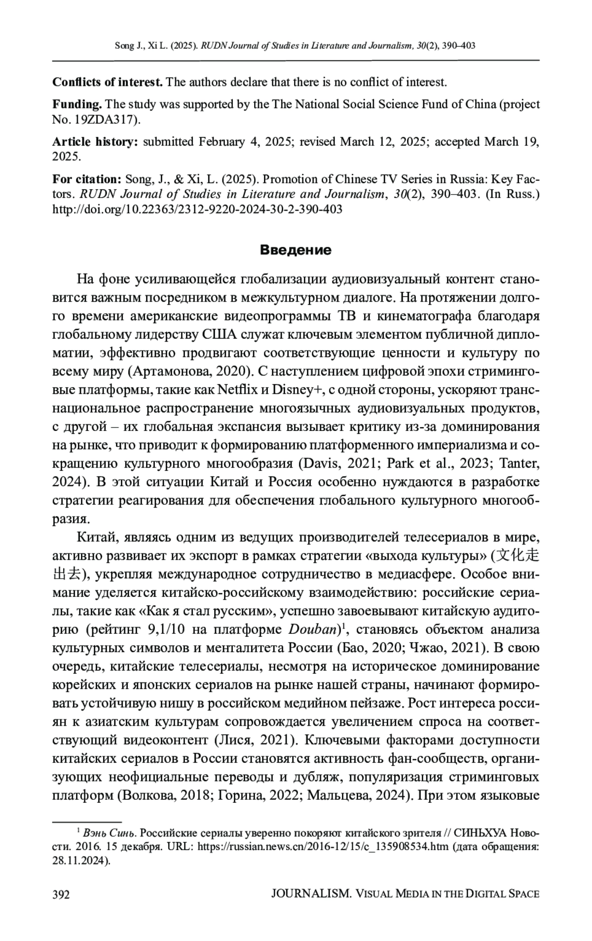 3. Ван С.王晓娟, 中国电视剧对俄传播现状与策略 [Современное состояние и стратегия распространения китайских телесериалов в России] // Китайское телевидение. 2019. № 8. С. 96-100.