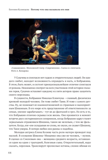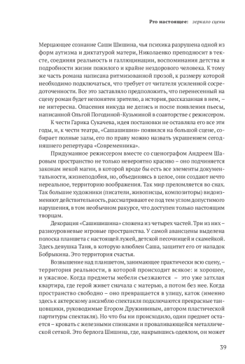 Мерца ю щее сознание Саши Шишина, чья психика разрушена одной из форм аутизма и диктатурой матери, Николаенко преподносит в тексте, соединяя реальность и галлюцинации, воспоминания детства и подробности жизни пожилого и крайне нездорового человека. К тому же часть романа написана ритмизованной прозой, к размеру которой необходимо подключаться, что требует от читателя усиленной сосредоточенности. Все это заставляло предположить, что перенесенный на сцену роман будет непонятен зрителю, а история, рассказанная в нем, – не интересна. Опасения никуда не делись и после появления пьесы, написанной Ольгой Погодиной-Кузьминой в соавторстве с режиссером.