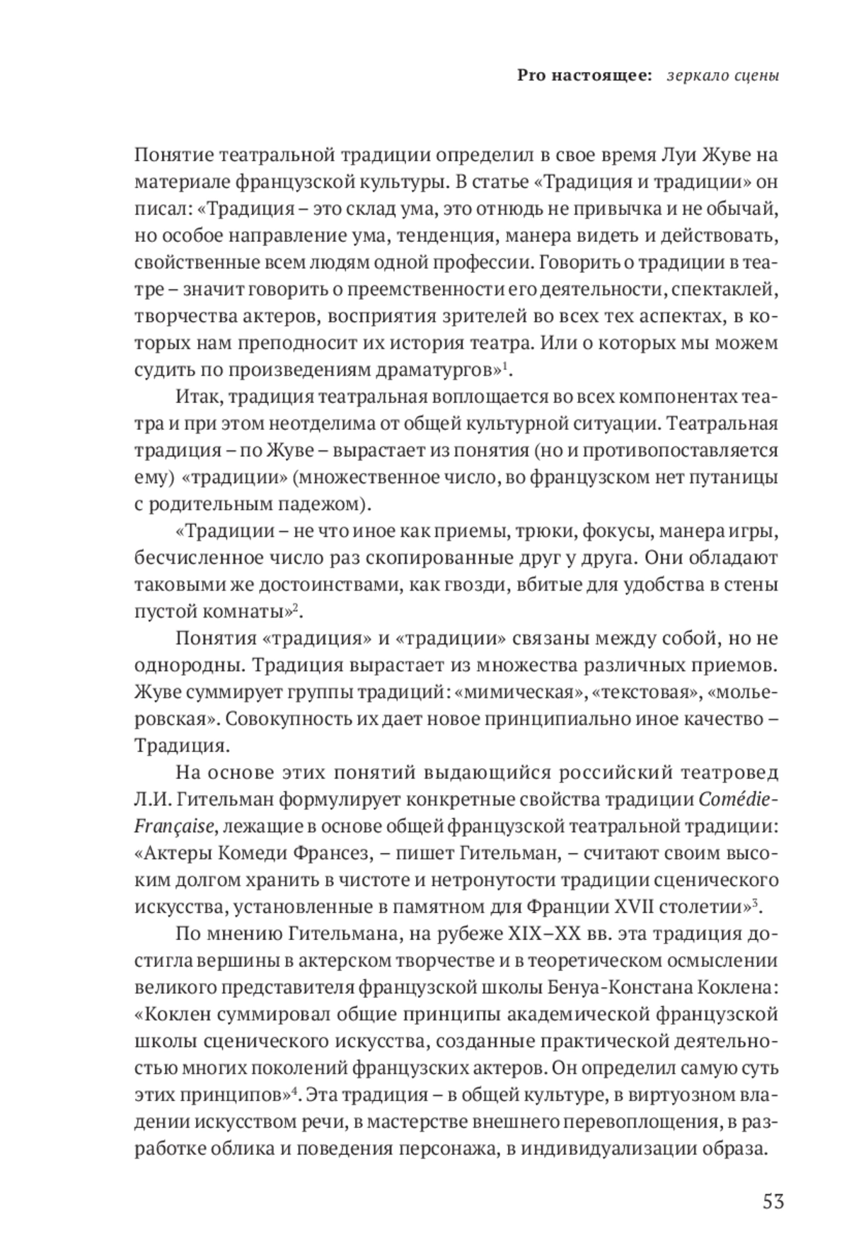 Понятие театральной традиции определил в свое время Луи Жуве на материале французской культуры. В статье «Традиция и традиции» он писал: «Традиция – это склад ума, это отнюдь не привычка и не обычай, но особое направление ума, тенденция, манера видеть и действовать, свойственные всем людям одной профессии. Говорить о традиции в театре – значит говорить о преемственности его деятельности, спектаклей, творчества актеров, восприятия зрителей во всех тех аспектах, в которых нам преподносит их история театра. Или о которых мы можем судить по произведениям драматургов»1.