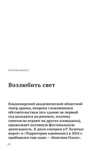 Владимирский академический областной театр драмы, вопреки сложившимся обстоятельствам (его здание не первый год находится на ремонте, поэтому спектакли играют на других площадках), продолжает активную фестивальную деятельность. К двум смотрам («У Золотых ворот» и «Территории единения») в 2024 г. прибавился еще один – «Княгиня Ольга».