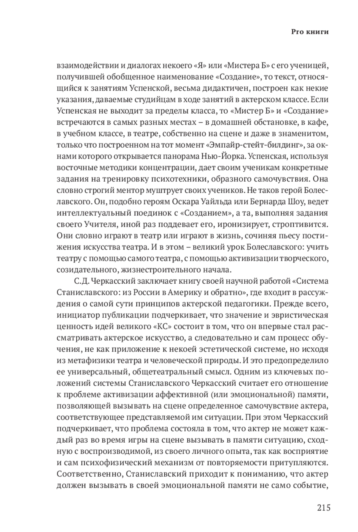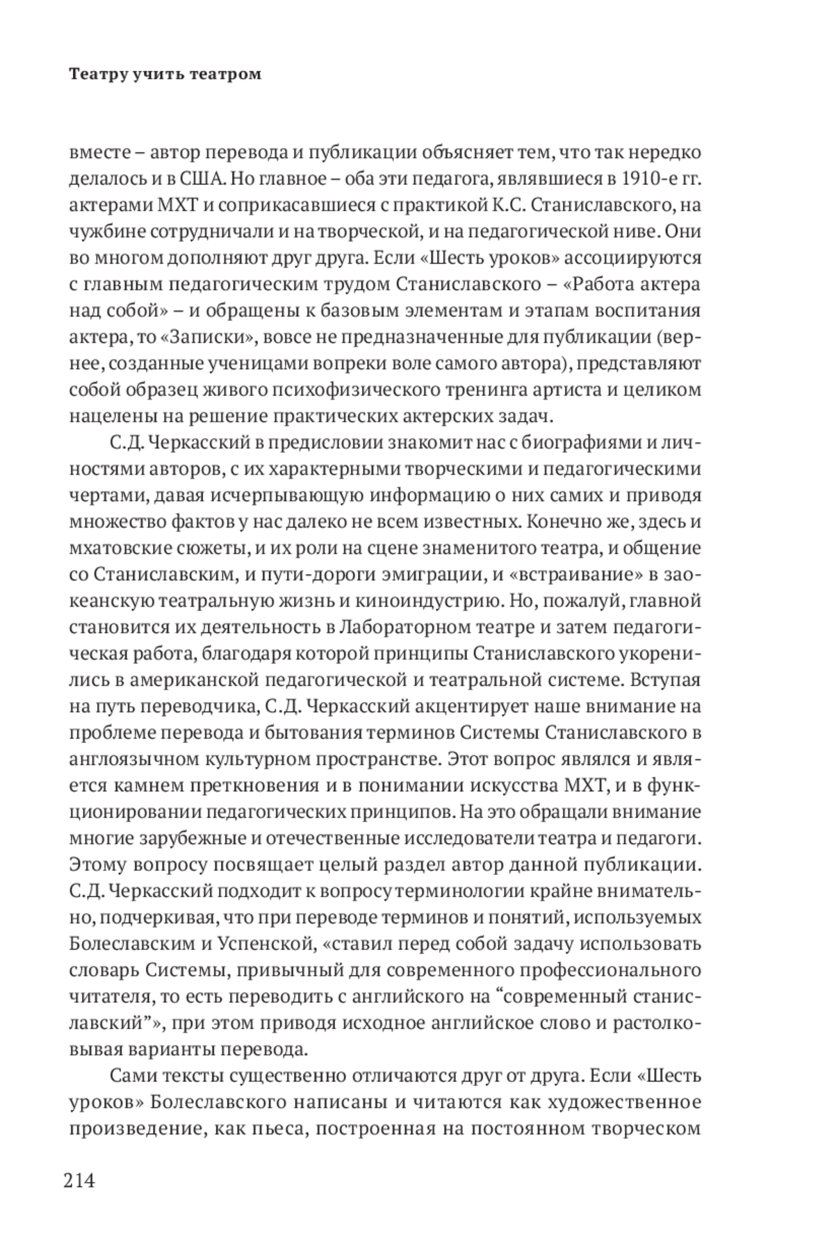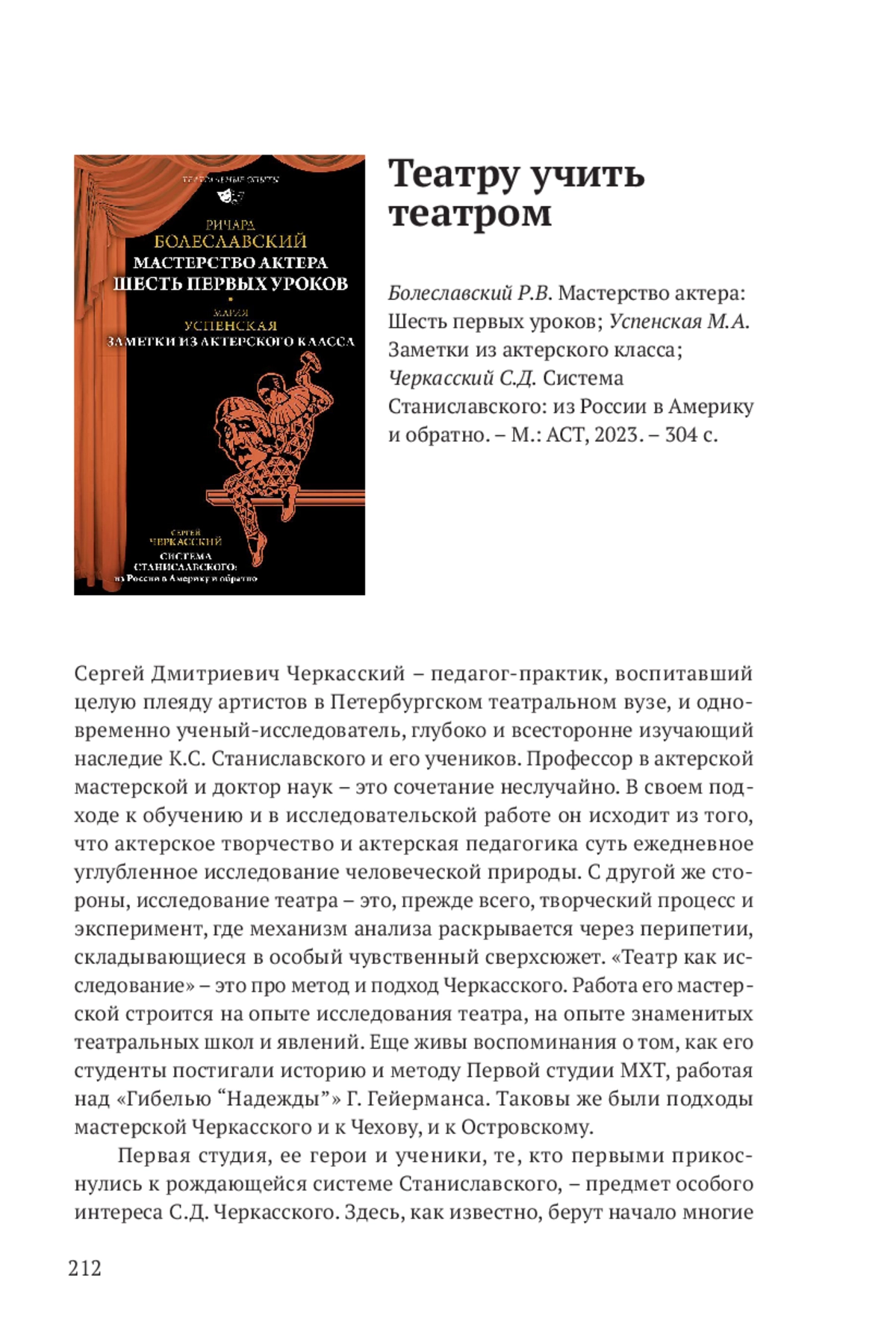Сергей Дмитриевич Черкасский – педагог-практик, воспитавший целую плеяду артистов в Петербургском театральном вузе, и одновременно ученый-исследователь, глубоко и всесторонне изучающий наследие К. С. Станиславского и его учеников. Профессор в актерской мастерской и доктор наук – это сочетание неслучайно. В своем подходе к обучению и в исследовательской работе он исходит из того, что актерское творчество и актерская педагогика суть ежедневное углубленное исследование человеческой природы. С другой же стороны, исследование театра – это, прежде всего, творческий процесс и эксперимент, где механизм анализа раскрывается через перипетии, складывающиеся в особый чувственный сверхсюжет. «Театр как исследование» – это про метод и подход Черкасского. Работа его мастерской строится на опыте исследования театра, на опыте знаменитых театральных школ и явлений. Еще живы воспоминания о том, как его студенты постигали историю и методу Первой студии МХТ, работая над «Гибелью “Надежды”» Г. Гейерманса. Таковы же были подходы мастерской Черкасского и к Чехову, и к Островскому.