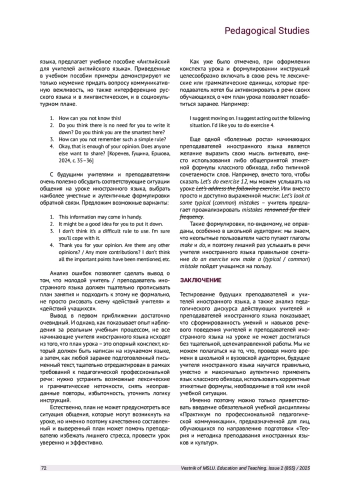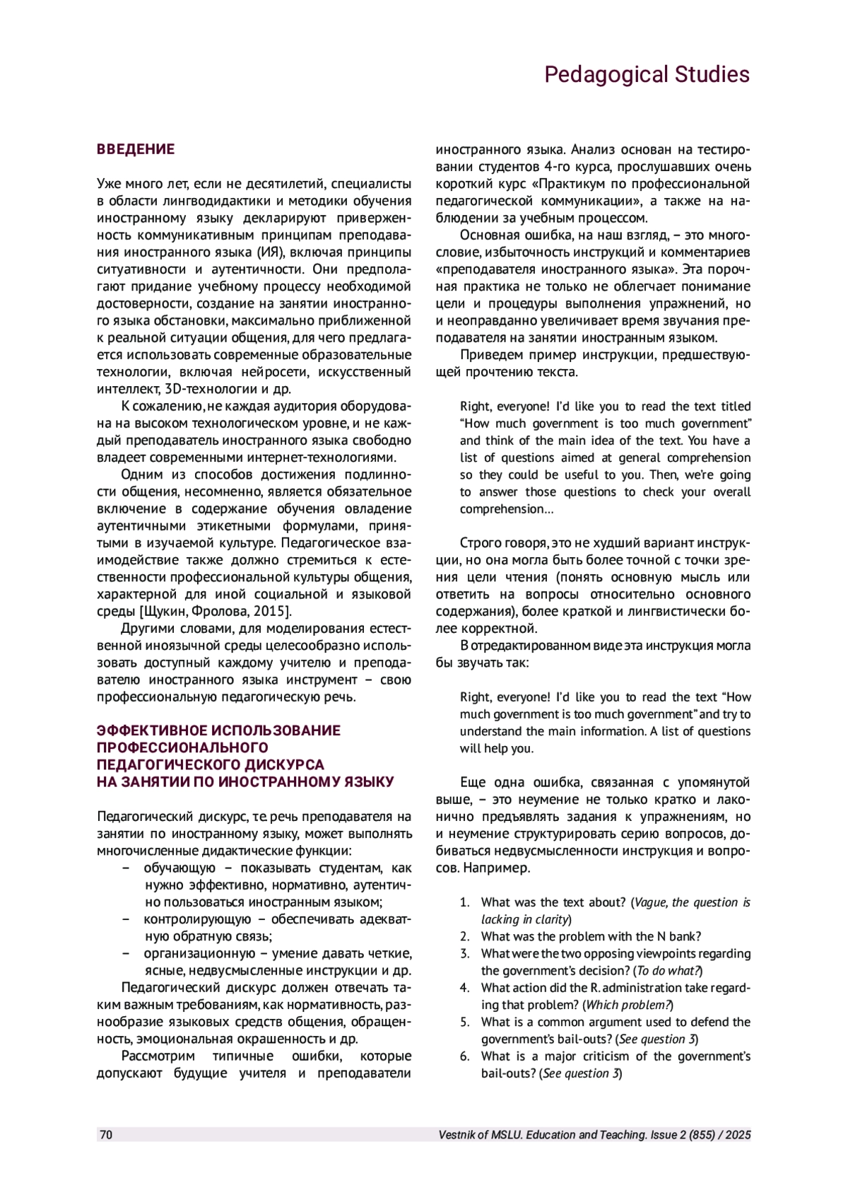 В статье рассматривается роль педагогического дискурса в создании ситуаций реального иноязычного общения, определяются функции и характеристики профессионального педагогического общения, выявляются типичные ошибки, которые допускают будущие и начинающие преподаватели иностранного языка в ходе осуществления педагогического взаимодействия с учащимися.