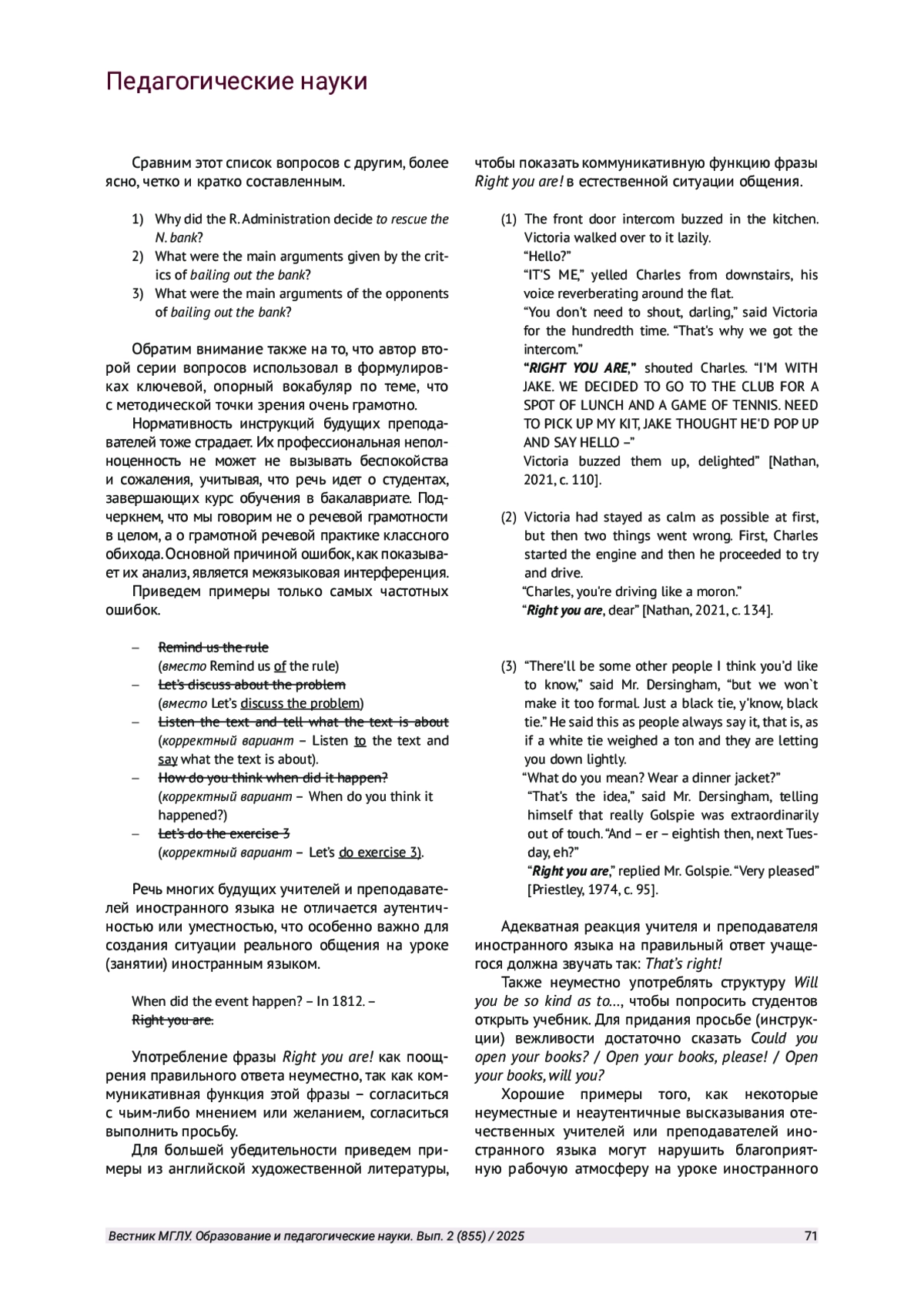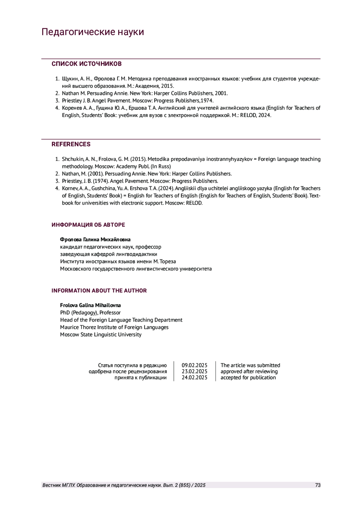 1. Щукин, А. Н., Фролова Г. М. Методика преподавания иностранных языков: учебник для студентов учреждений высшего образования. М.: Академия, 2015. EDN: GYBGVI