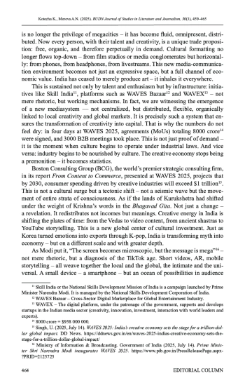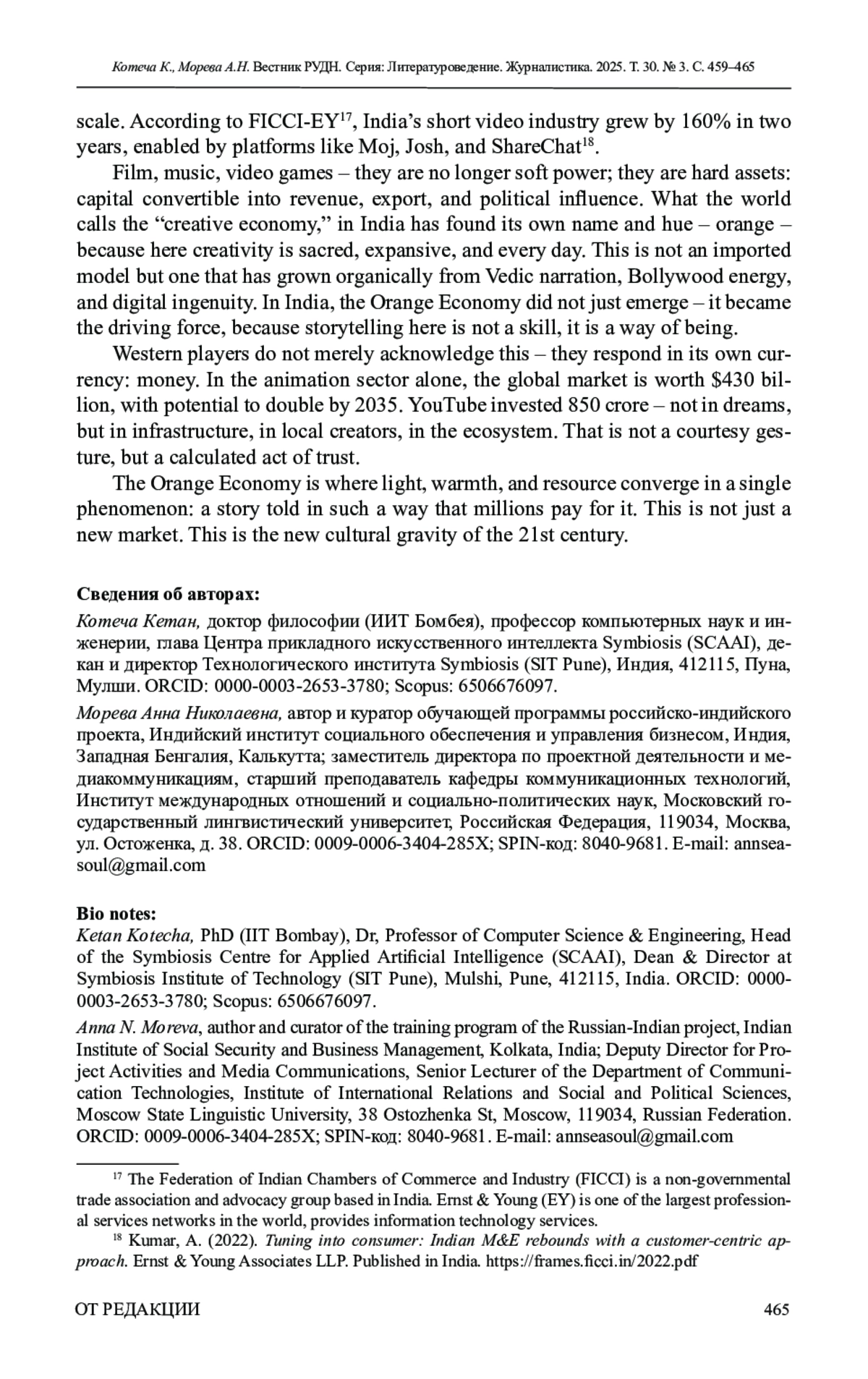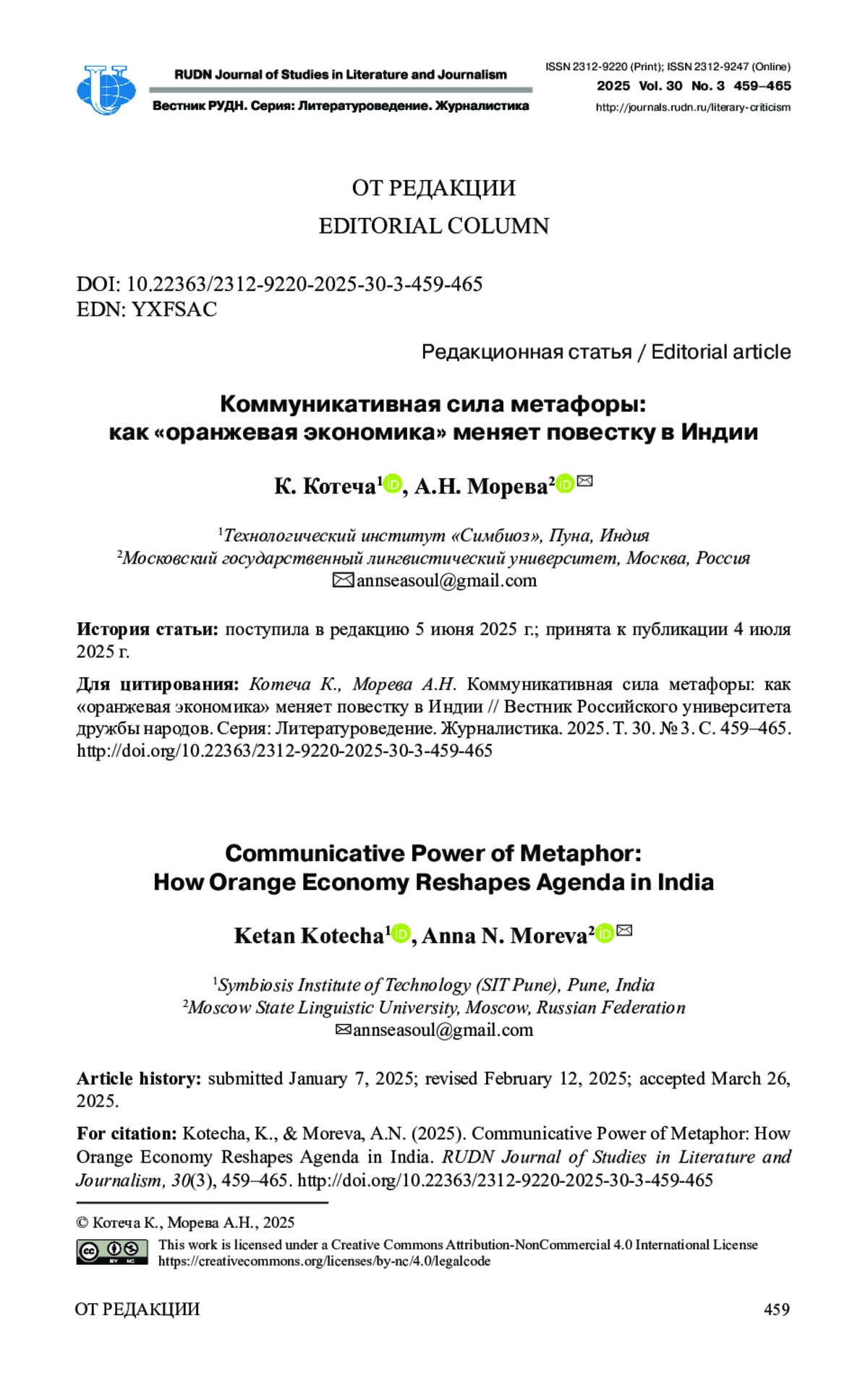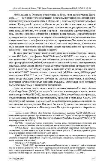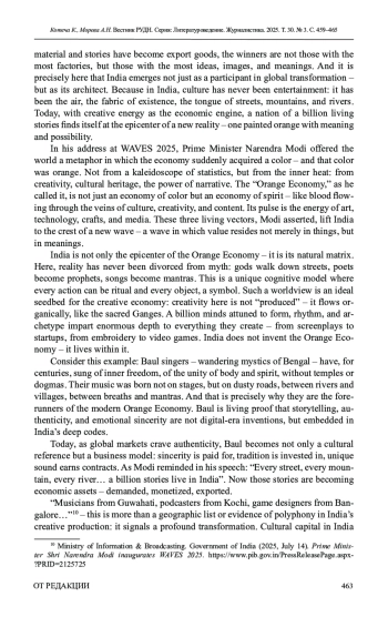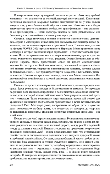 Для цитирования: Котеча К., Морева А. Н. Коммуникативная сила метафоры: как «оранжевая экономика» меняет повестку в Индии // Вестник Российского университета дружбы народов. Серия: Литературоведение. Журналистика. 2025. Т. 30. № 3. С. 459–465. http://doi. org/10.22363/2312-9220-2025-30-3-459-465