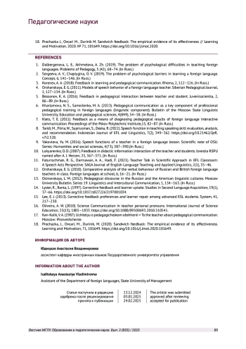 18. Prochazka J., Ovcari M., Durinik M. Sandwich feedback: The empirical evidence of its effectiveness // Learning and Motivation. 2020. № 71, 101649. DOI: 10.1016/j.lmot.2020 EDN: AWSPPW