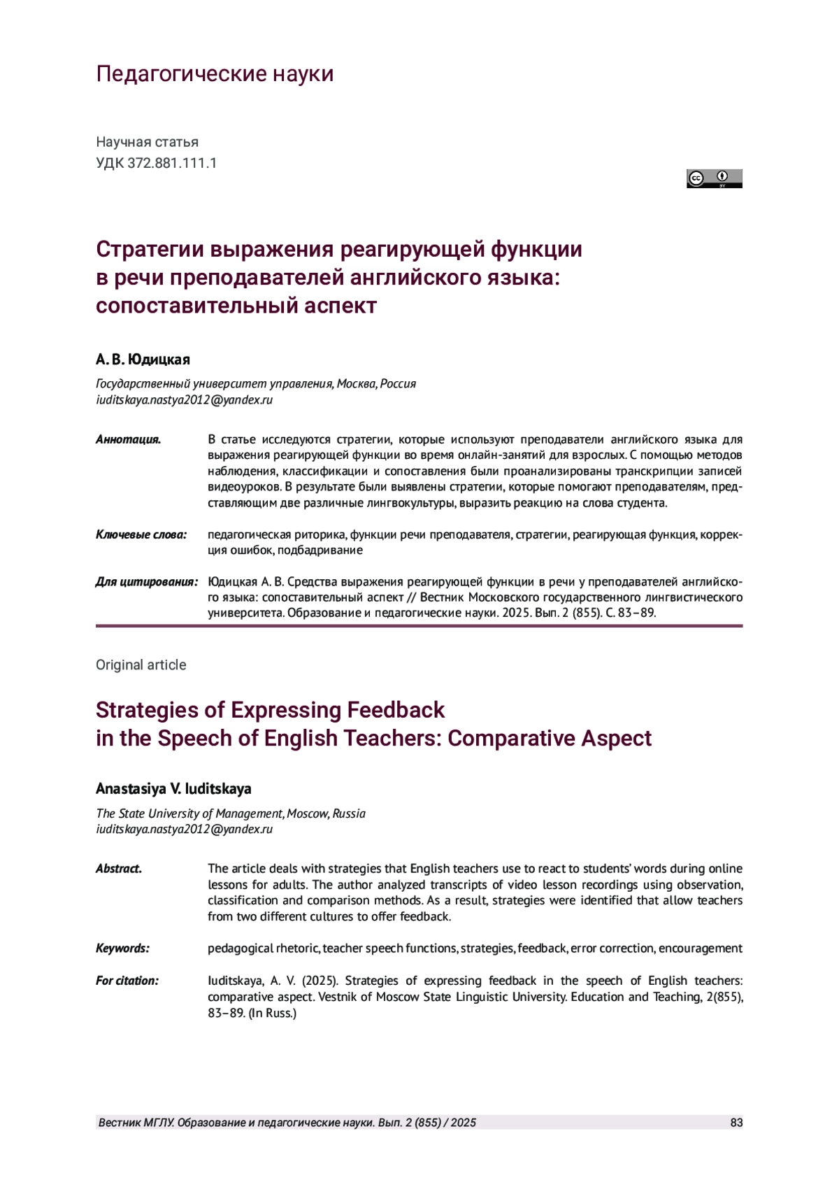 12. Оршанская Е. Г. Опыт сопоставительного анализа речевого поведения российского и британского учителя ИЯ в классе // Иностранные языки в школе. 2010. № 6. С. 16-21. EDN: MSNVYV