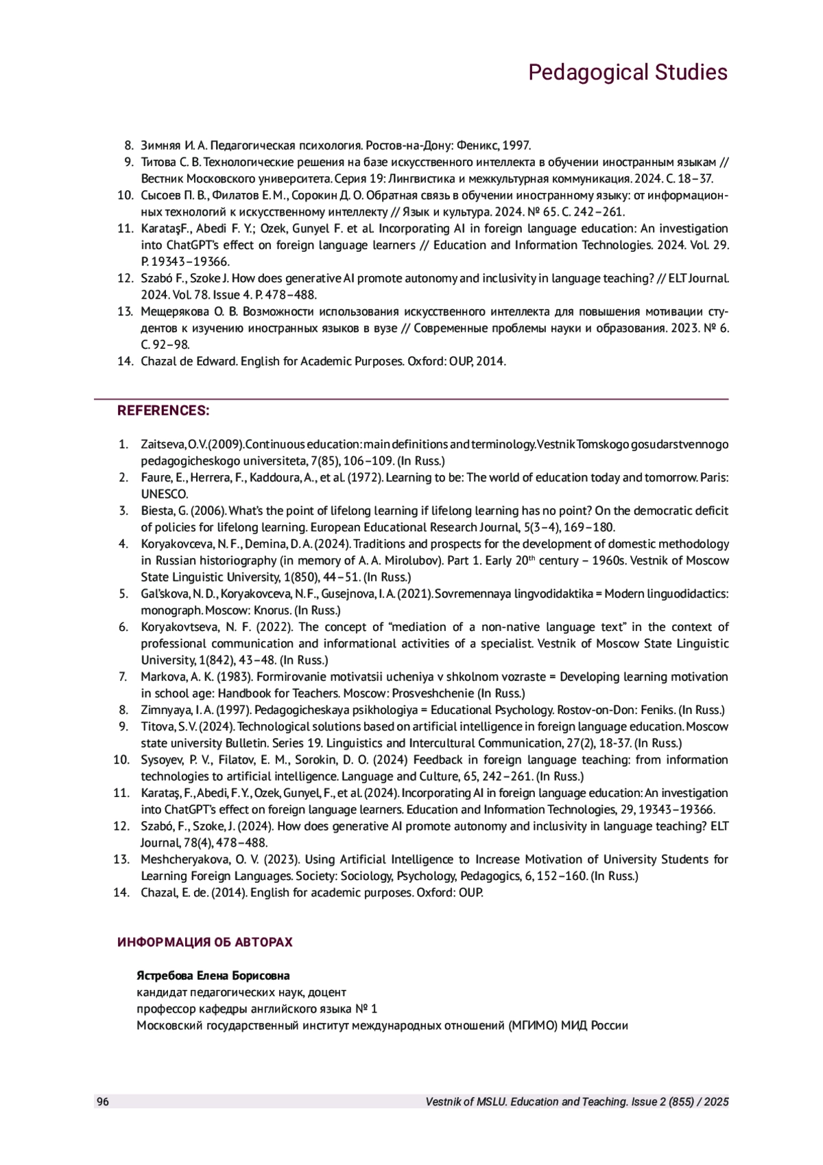 9. Титова С. В. Технологические решения на базе искусственного интеллекта в обучении иностранным языкам // Вестник Московского университета. Серия 19: Лингвистика и межкультурная коммуникация. 2024. С. 18-37. EDN: OWSQVG