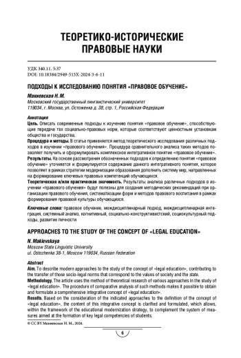 Процедура и методы. В статье применяется метод теоретического исследования различных подходов в изучении «правового обучения». Процедура сравнительного анализа таких методов позволяет получить и сформулировать комплексное интегративное понятие «правовое обучение».