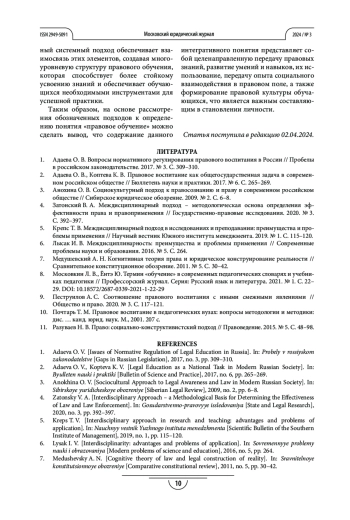 1. Адаева О. В. Вопросы нормативного регулирования правового воспитания в России // Пробелы в российском законодательстве. 2017. № 3. С. 309-310.