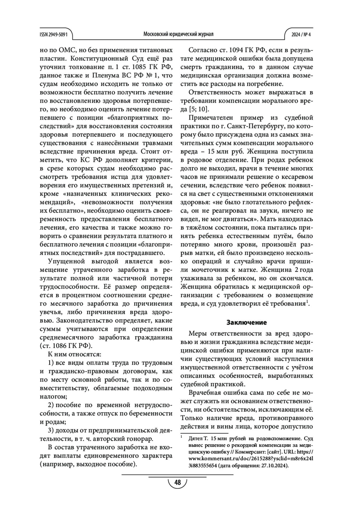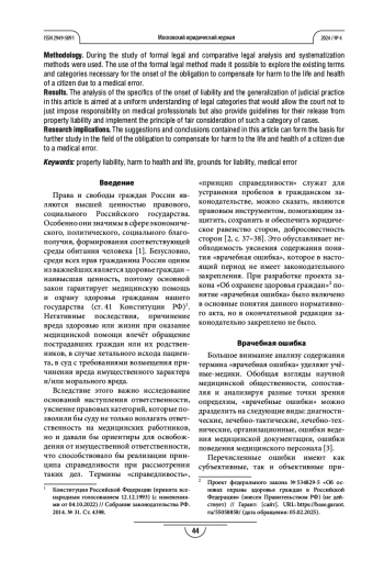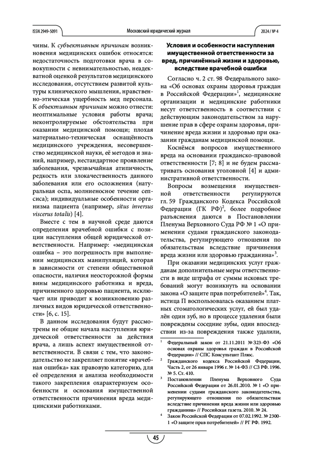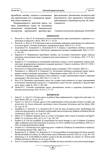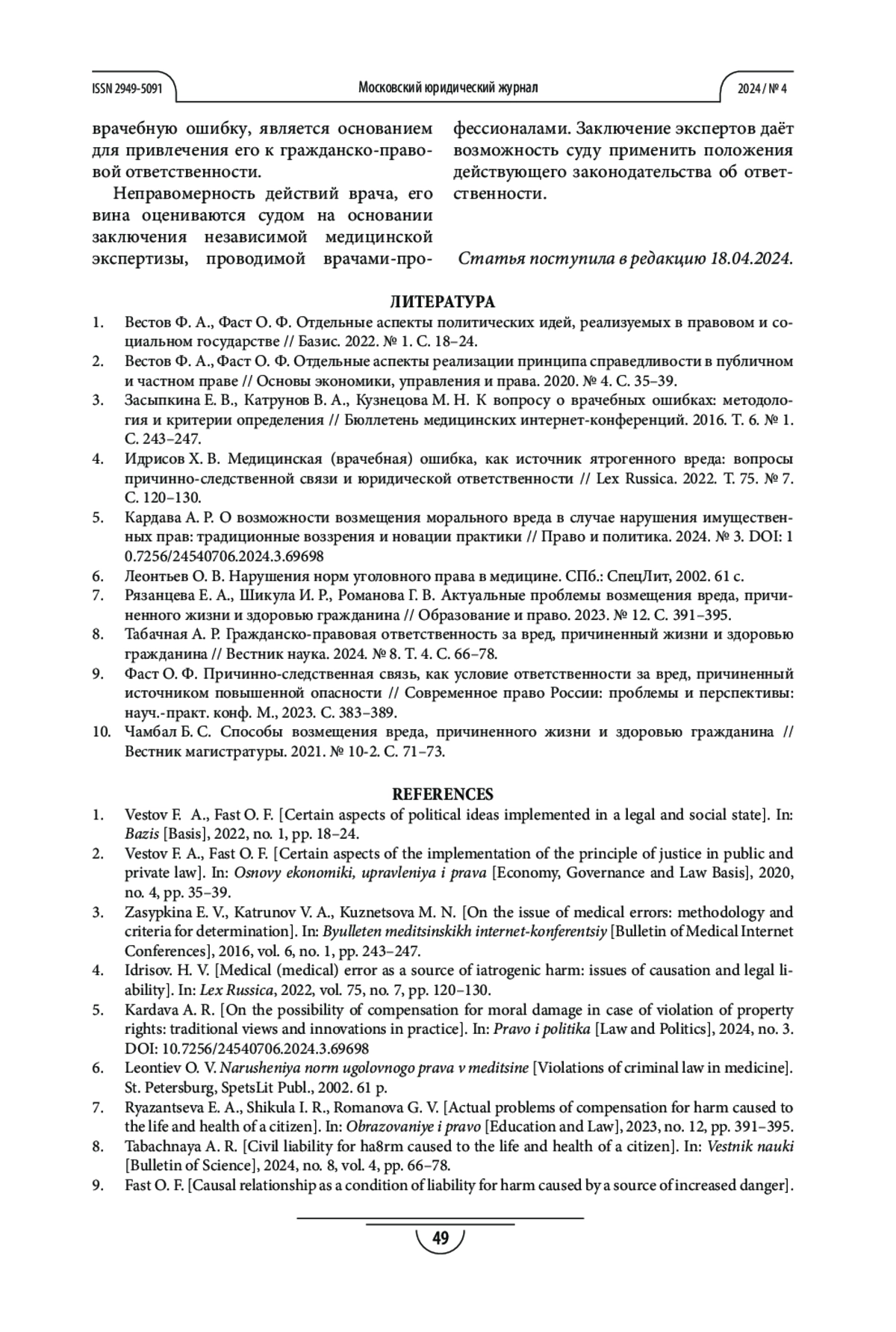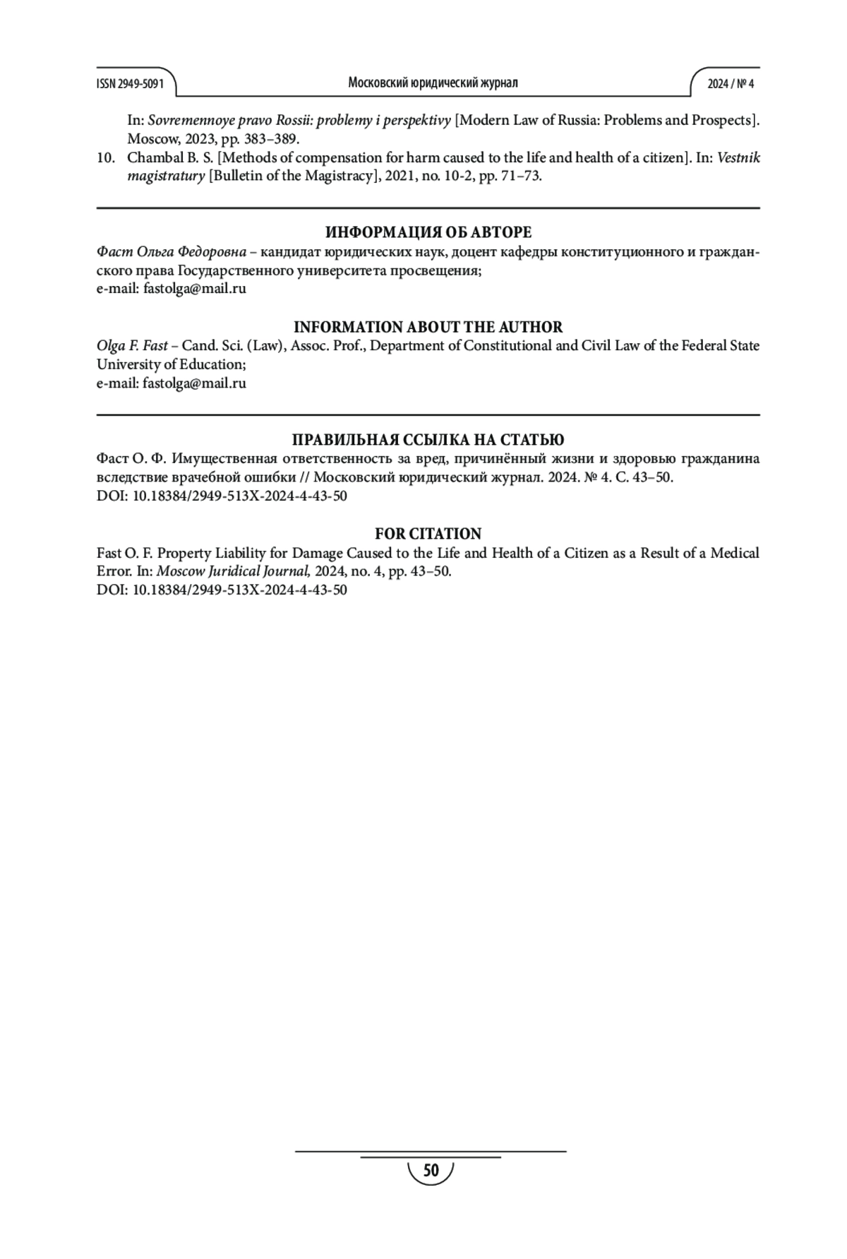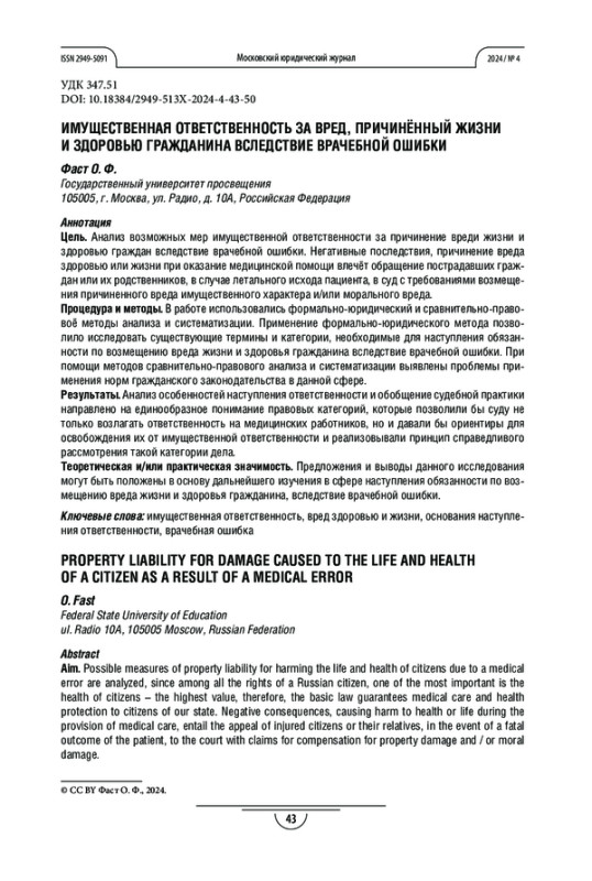 ФАСТ О. Ф. ИМУЩЕСТВЕННАЯ ОТВЕТСТВЕННОСТЬ ЗА ВРЕД, ПРИЧИНЁННЫЙ ЖИЗНИ И ЗДОРОВЬЮ ГРАЖДАНИНА ВСЛЕДСТВИЕ ВРАЧЕБНОЙ ОШИБКИ // МОСКОВСКИЙ ЮРИДИЧЕСКИЙ ЖУРНАЛ. 2024. 2024 / №4