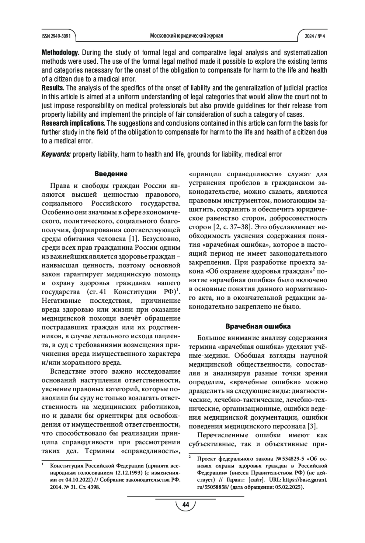 Статья: Имущественная ответственность за вред, причинённый жизни и здоровью гражданина вследствие врачебной ошибки (2024)