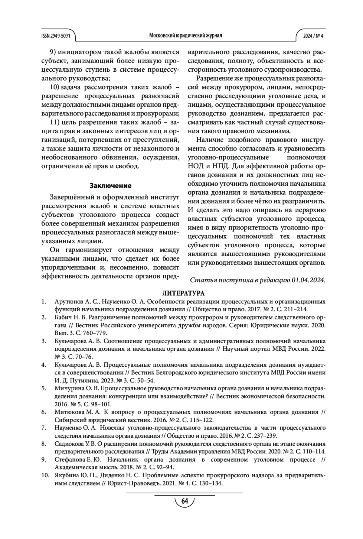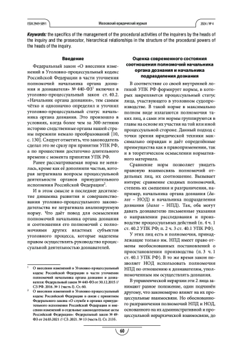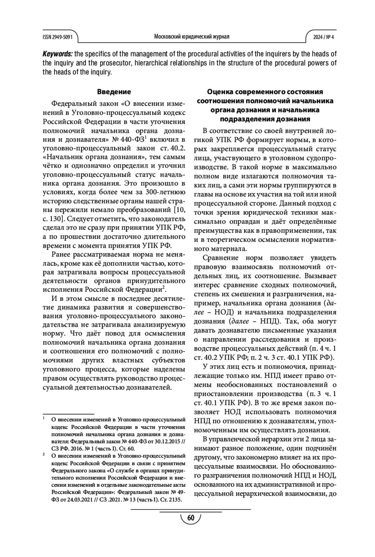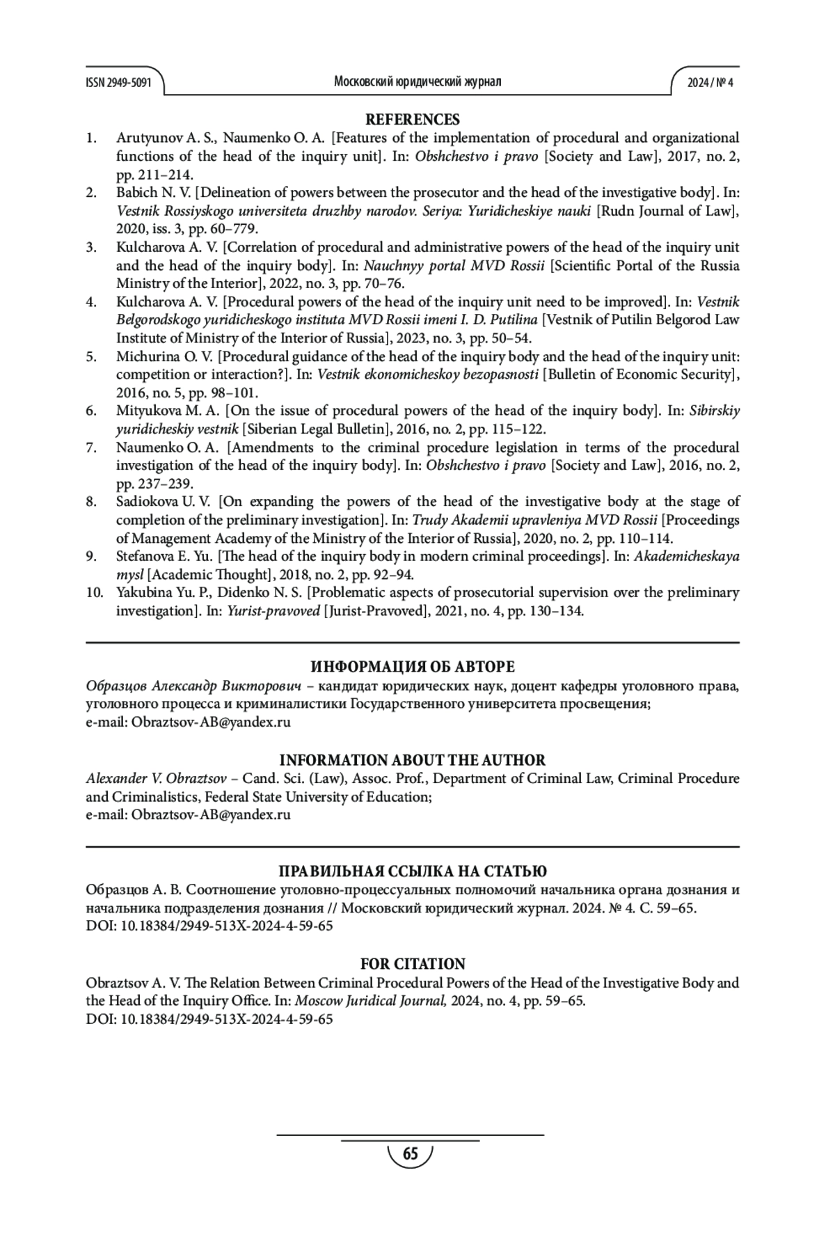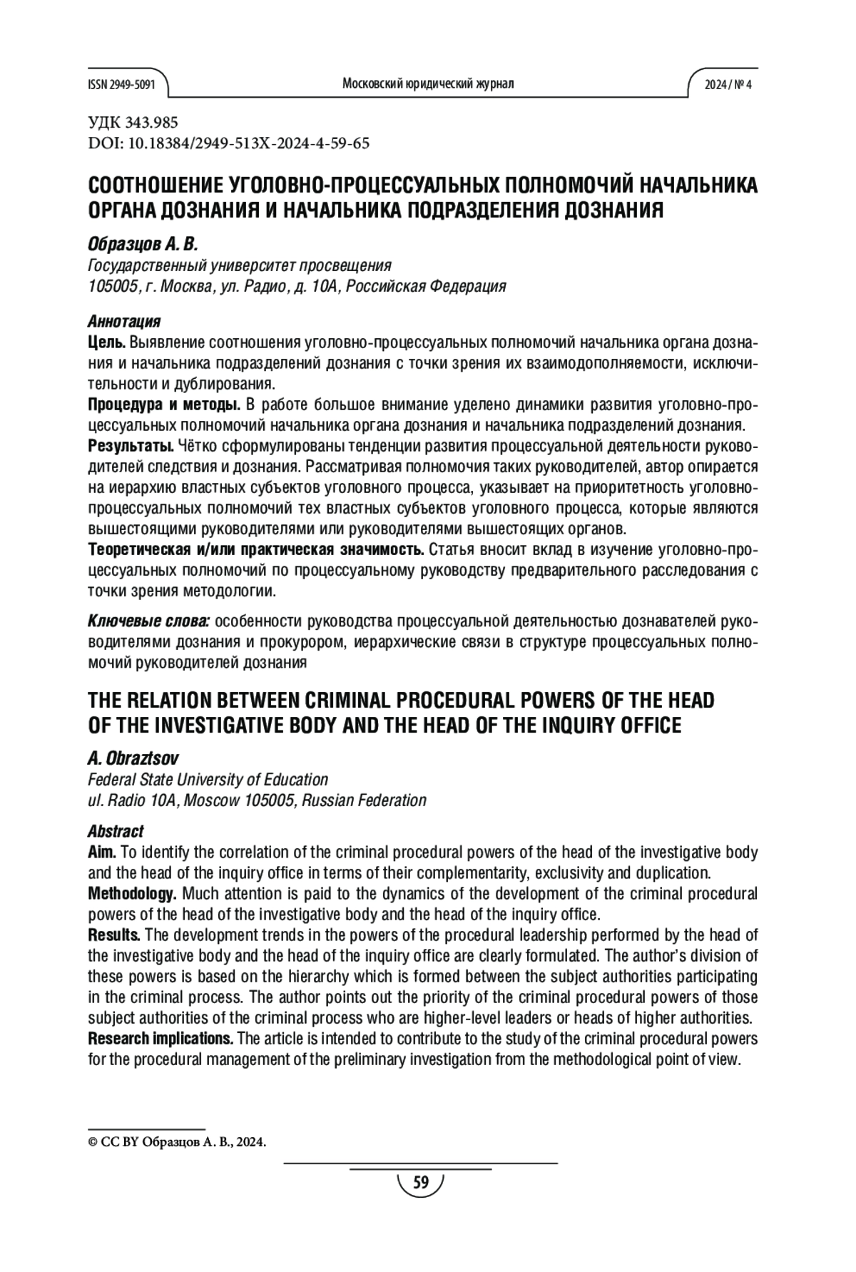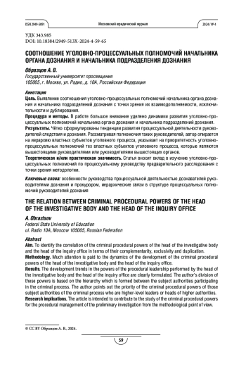 ОБРАЗЦОВ А. В. СООТНОШЕНИЕ УГОЛОВНО-ПРОЦЕССУАЛЬНЫХ ПОЛНОМОЧИЙ НАЧАЛЬНИКА ОРГАНА ДОЗНАНИЯ И НАЧАЛЬНИКА ПОДРАЗДЕЛЕНИЯ ДОЗНАНИЯ // МОСКОВСКИЙ ЮРИДИЧЕСКИЙ ЖУРНАЛ. 2024. 2024 / №4