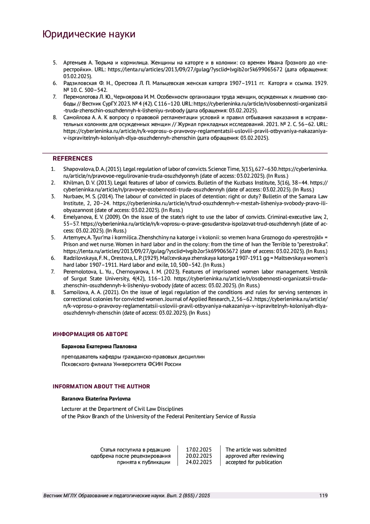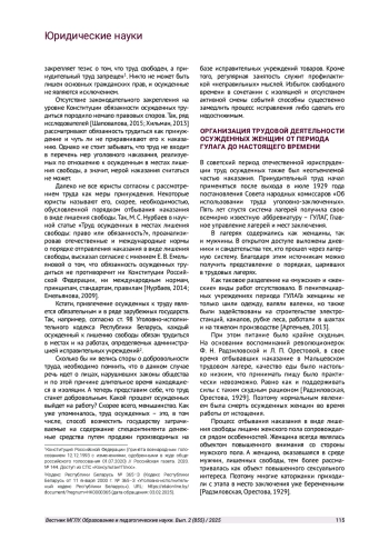 7. Перемолотова Л. Ю., Черноярова И. М. Особенности организации труда женщин, осужденных к лишению свободы // Вестник СурГУ. 2023. № 4 (42). С 116-120. URL: https://cyberleninka.ru/article/n/osobennosti-organizatsii -truda-zhenschin-osuzhdennyh-k-lisheniyu-svobody (дата обращения: 03.02.2025).