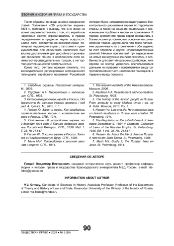 В статье на основе анализа нормативных правовых актов и научной литературы рассмотрена проблема ограничения права на свободное перемещение еврейского населения Российской империи в конце XVIII – первой четверти XIX в. Сделан вывод о том, что в пределах черты оседлости ограничений по перемещению еврейского населения, угрожавших его жизнедеятельности, не вводилось. Более того, нормы рассмотренного Положения «Об устройстве евреев» указывают на значительное число привилегий для их различных категорий