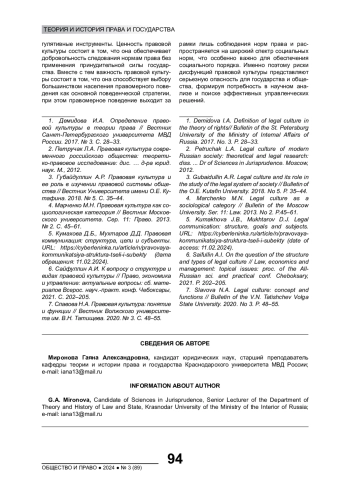 МИРОНОВА Г. А. ПРАВОВАЯ КУЛЬТУРА КАК ИНСТРУМЕНТ ПРОФИЛАКТИКИ ПРАВОНАРУШЕНИЙ И ОБЕСПЕЧЕНИЯ УСТОЙЧИВОГО ПРАВОМЕРНОГО ПОВЕДЕНИЯ // ОБЩЕСТВО И ПРАВО. 2024. № 3 (89)