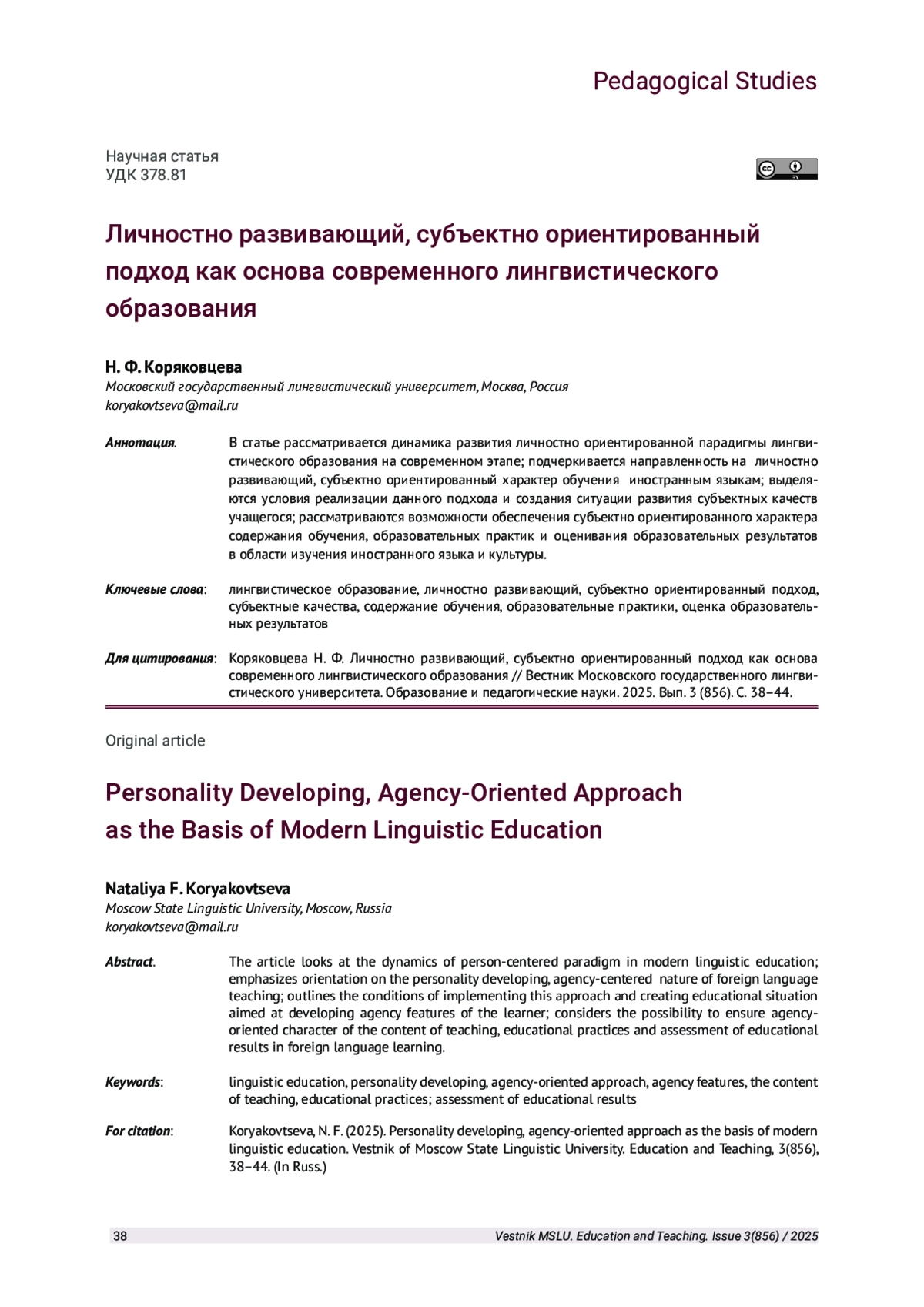 В статье рассматривается динамика развития личностно ориентированной парадигмы лингвистического образования на современном этапе; подчеркивается направленность на личностно развивающий, субъектно ориентированный характер обучения иностранным языкам; выделяются условия реализации данного подхода и создания ситуации развития субъектных качеств учащегося; рассматриваются возможности обеспечения субъектно ориентированного характера содержания обучения, образовательных практик и оценивания образовательных результатов в области изучения иностранного языка и культуры.