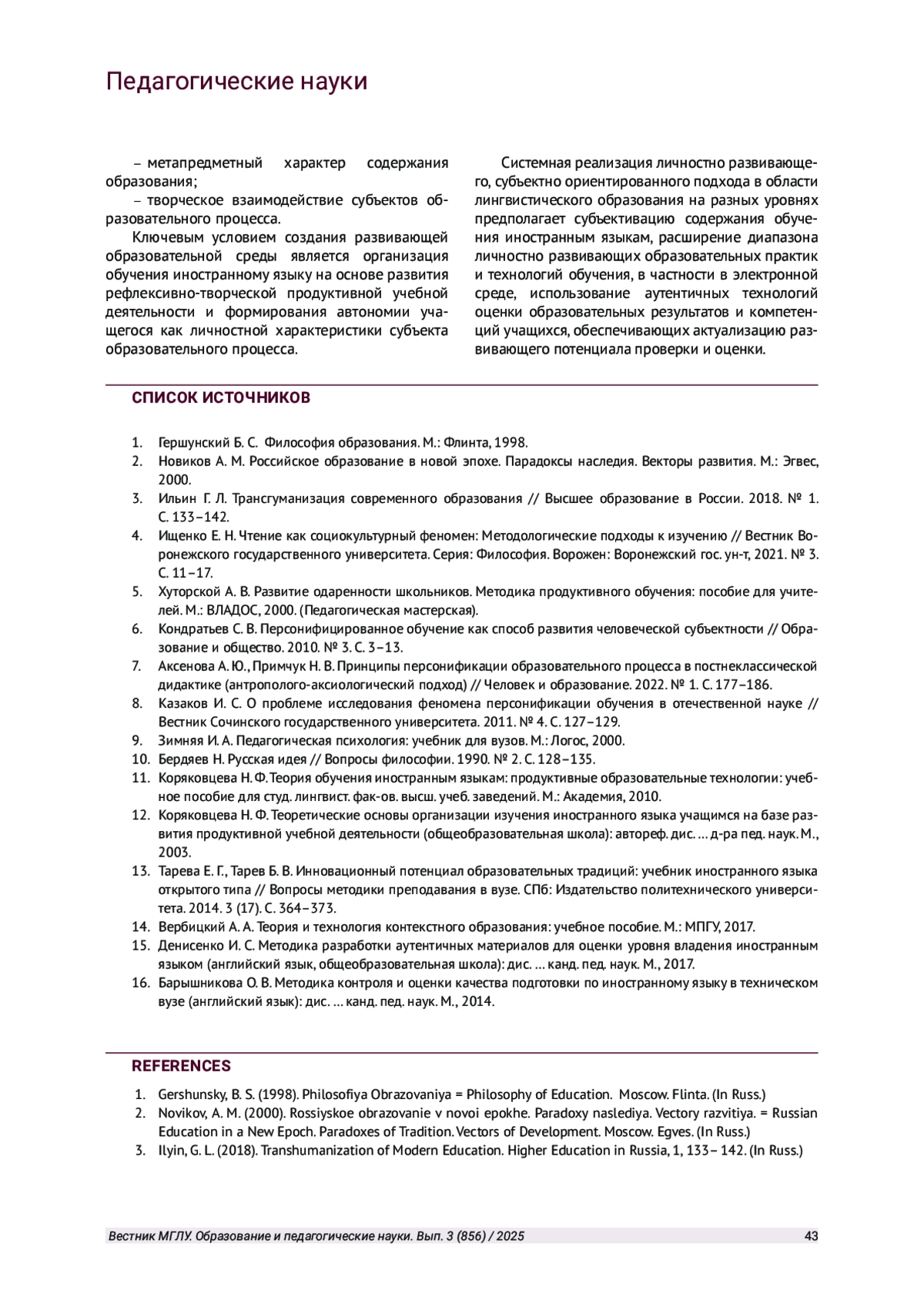 3. Ильин Г. Л. Трансгуманизация современного образования // Высшее образование в России. 2018. № 1. С. 133-142. EDN: YMVEUM