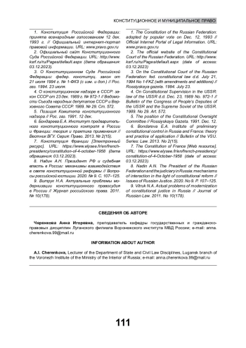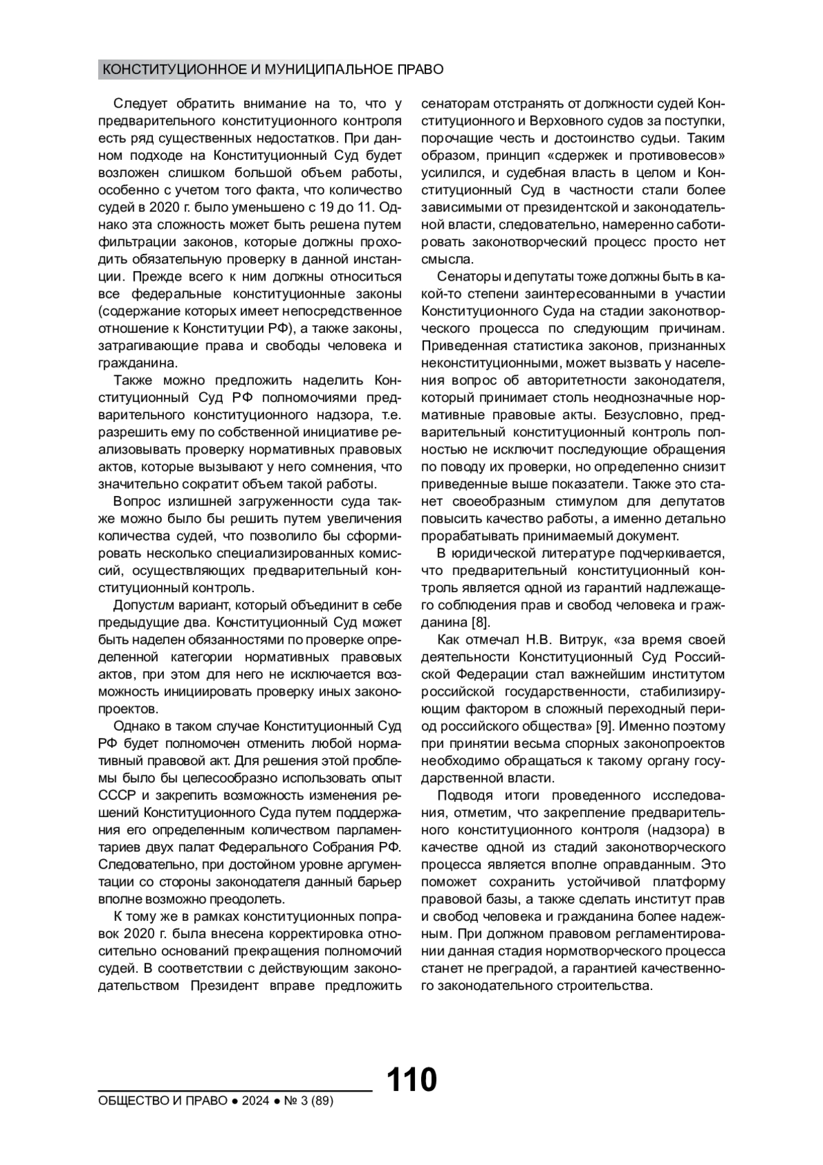 ЧЕРЕНКОВА А. И. ПРЕДВАРИТЕЛЬНЫЙ КОНСТИТУЦИОННЫЙ КОНТРОЛЬ - НЕОБХОДИМЫЙ АТРИБУТ НОРМОТВОРЧЕСКОГО ПРОЦЕССА // ОБЩЕСТВО И ПРАВО. 2024. № 3 (89)