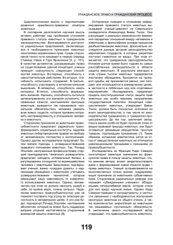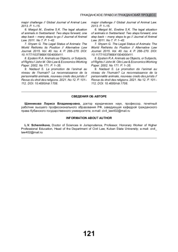 В центре внимания автора проблема построения новой парадигмы отношений человека и животных, создания для животных адекватного гражданско-правового статуса, учитывающего их значение и роль в жизни современного общества. Автор констатирует, что животные являются даром природы, благом, необходимым условием для обеспечения качества жизни. При этом в действующем гражданском законодательстве Российской Федерации им придается ярко выраженный статус вещи, они рассматриваются как объекты права собственности. Аналогичную позицию занимает и отечественная судебная практика. С учетом достижений мировой цивилистической науки, созданных судебных прецедентов, признающих за животными особый правовой статус личности, автор приходит к мысли о том, что отечественный законодатель, а также суды в процессе правоприменения должны задуматься над необходимостью изменения гражданско-правового статуса животных, признав их разумными живыми существами, достойными не только создания благоприятных условий жизни, но и уважения со стороны человека. Автор формулирует конкретные предложения по совершенствованию отечественного гражданского законодательства, определяющего правовое положение животных