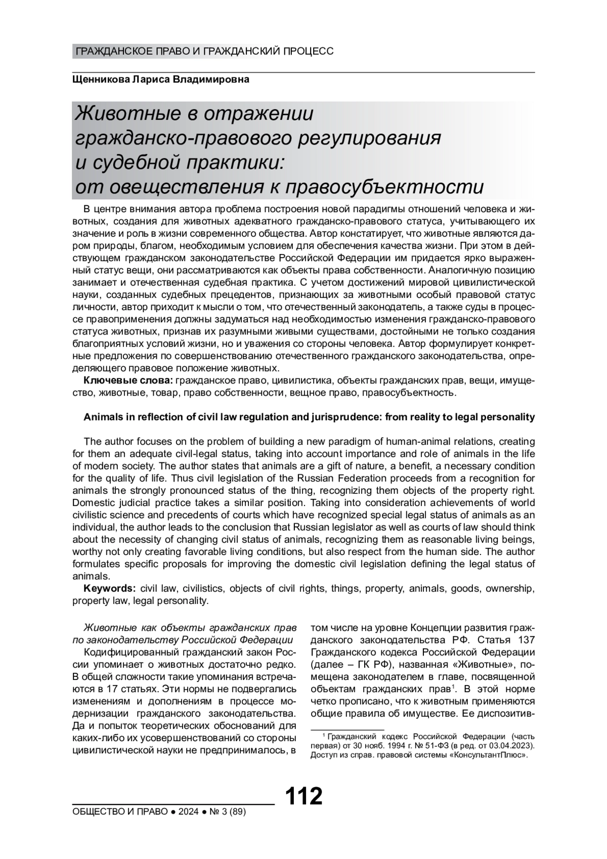ЩЕННИКОВА Л. В. ЖИВОТНЫЕ В ОТРАЖЕНИИ ГРАЖДАНСКО-ПРАВОВОГО РЕГУЛИРОВАНИЯ И СУДЕБНОЙ ПРАКТИКИ: ОТ ОВЕЩЕСТВЛЕНИЯ К ПРАВОСУБЪЕКТНОСТИ // ОБЩЕСТВО И ПРАВО. 2024. № 3 (89)