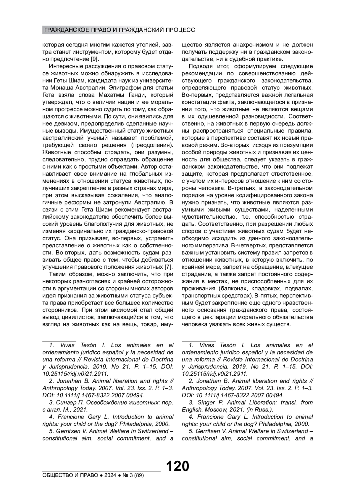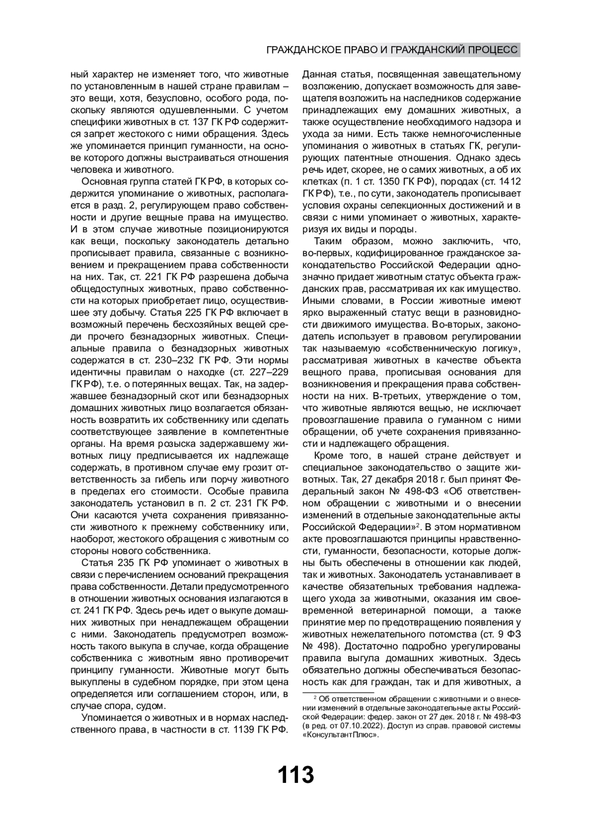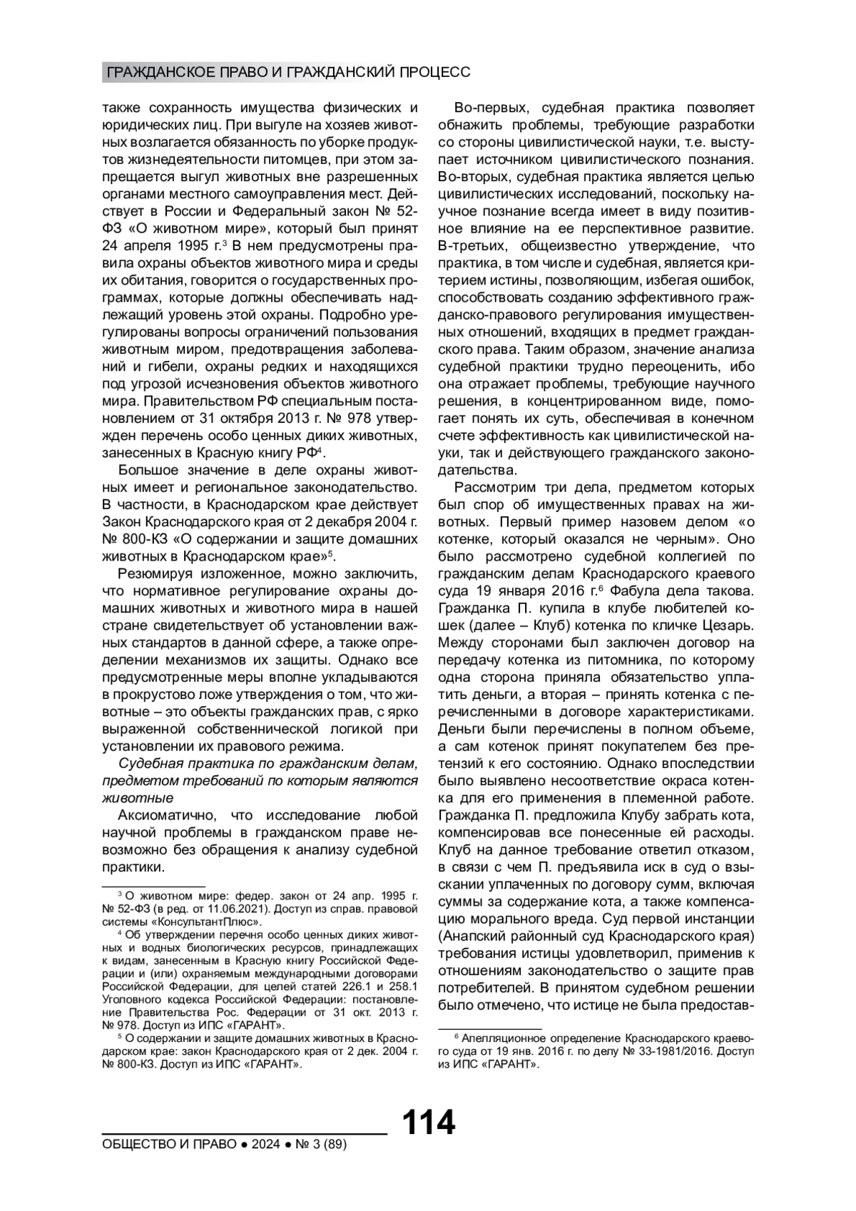 Статья: ЖИВОТНЫЕ В ОТРАЖЕНИИ ГРАЖДАНСКО-ПРАВОВОГО РЕГУЛИРОВАНИЯ И СУДЕБНОЙ ПРАКТИКИ: ОТ ОВЕЩЕСТВЛЕНИЯ К ПРАВОСУБЪЕКТНОСТИ (2024)