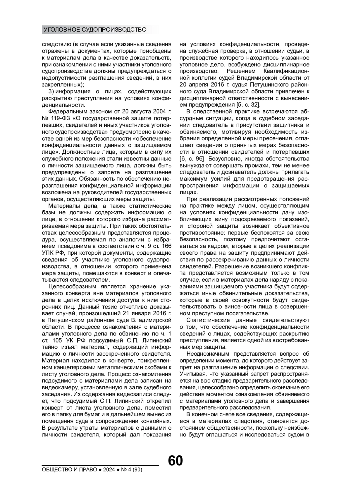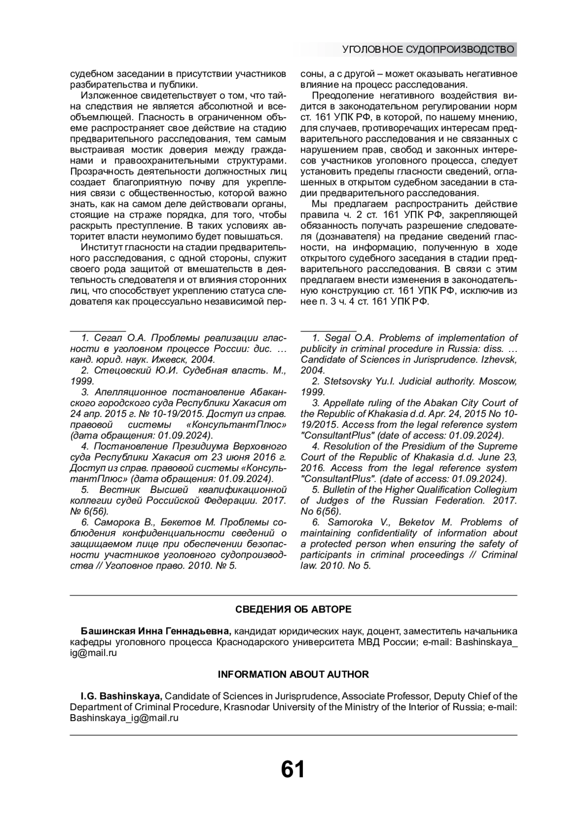 БАШИНСКАЯ И. Г. ПРЕДЕЛЫ ГЛАСНОСТИ ПРЕДВАРИТЕЛЬНОГО РАССЛЕДОВАНИЯ // ОБЩЕСТВО И ПРАВО. 2024. № 4 (90)