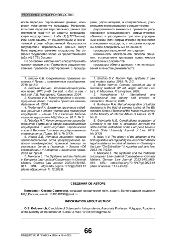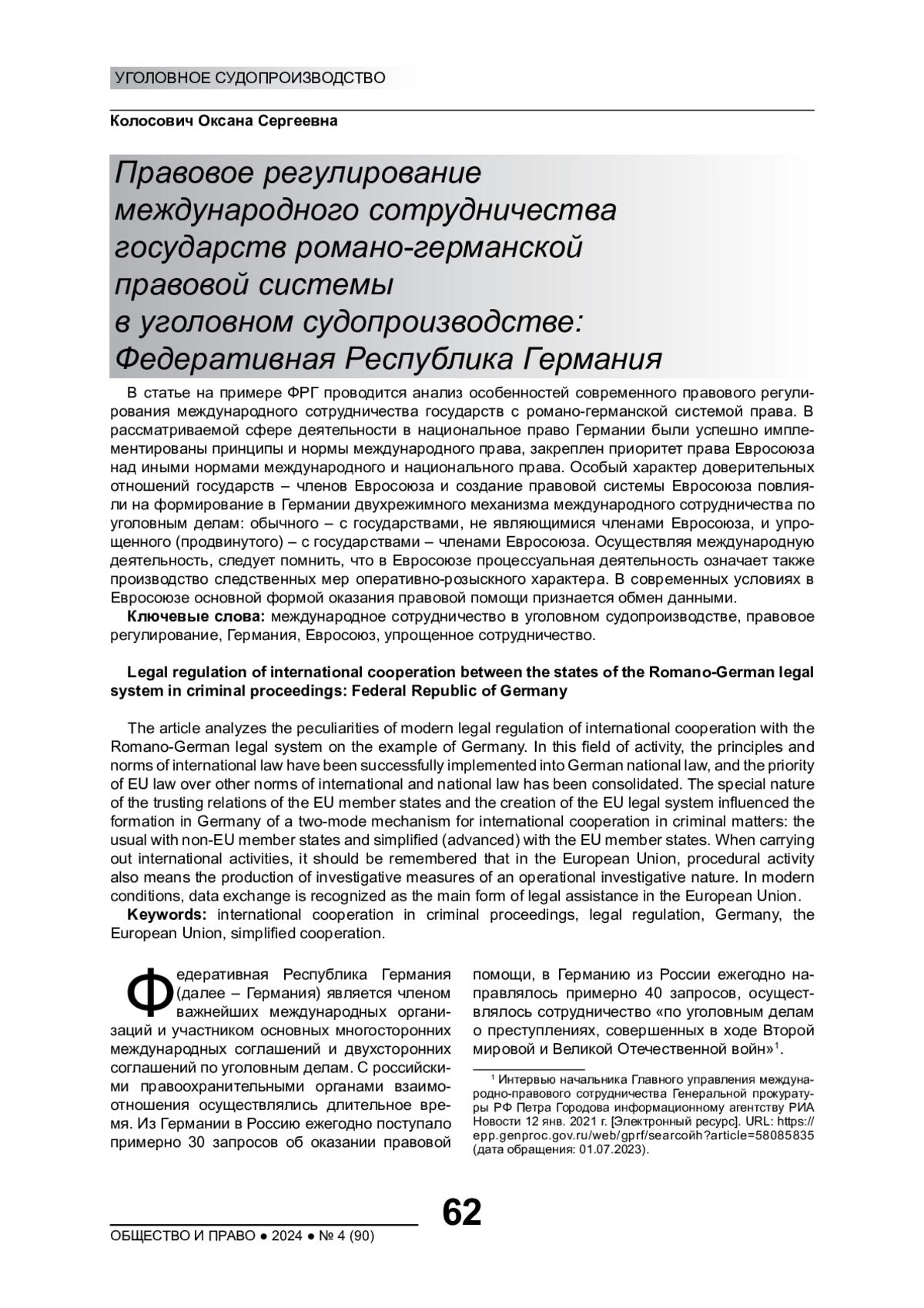 КОЛОСОВИЧ О. С. ПРАВОВОЕ РЕГУЛИРОВАНИЕ МЕЖДУНАРОДНОГО СОТРУДНИЧЕСТВА ГОСУДАРСТВ РОМАНО-ГЕРМАНСКОЙ ПРАВОВОЙ СИСТЕМЫ В УГОЛОВНОМ СУДОПРОИЗВОДСТВЕ: ФЕДЕРАТИВНАЯ РЕСПУБЛИКА ГЕРМАНИЯ // ОБЩЕСТВО И ПРАВО. 2024. № 4 (90)