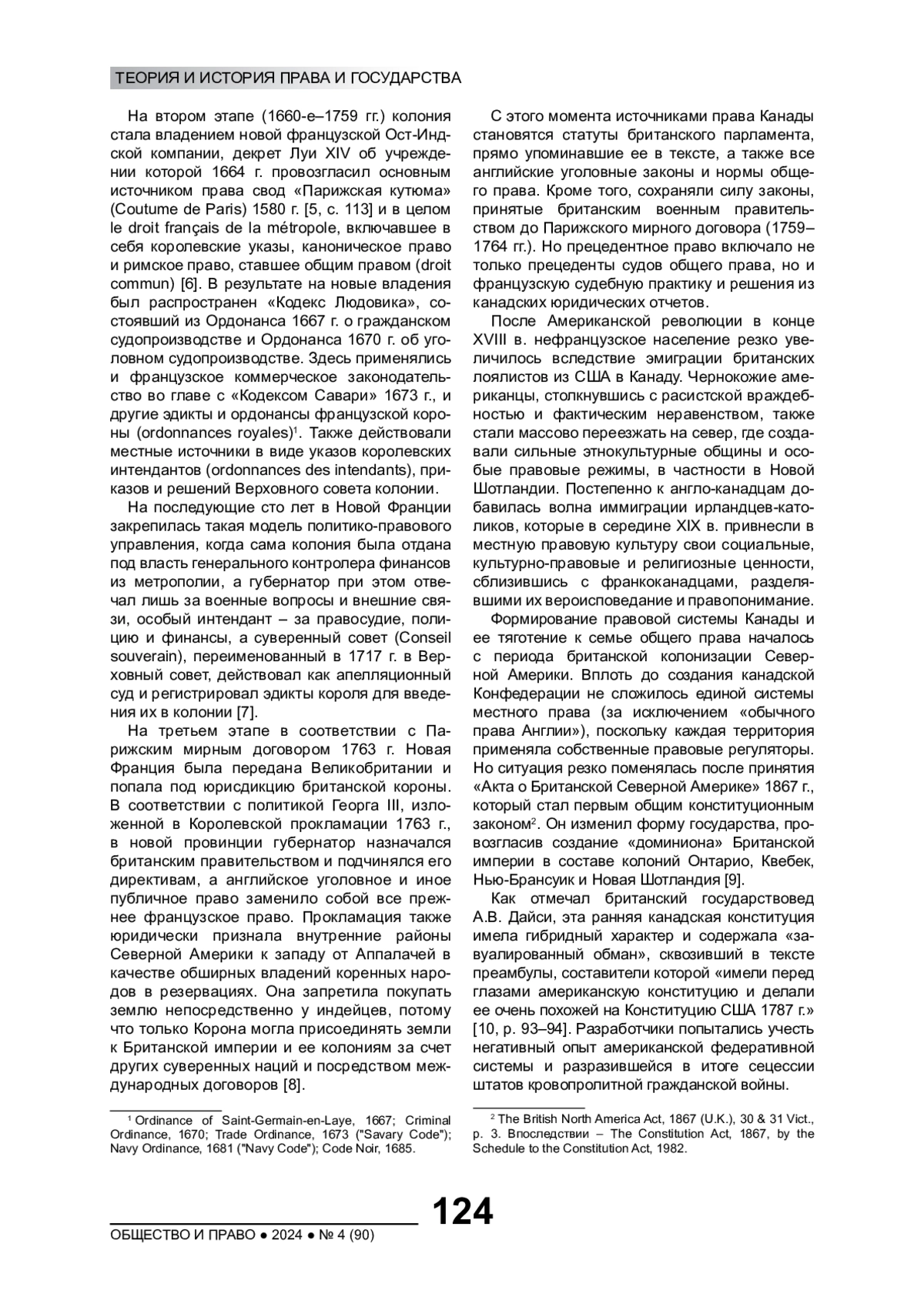 Предлагается авторская периодизация истории становления национальной юридической системы Канады. Рассматривается специфика системы источников права Новой Франции – будущей Канады в колониальный период. Выделяются особенности канадского политико-правового устройства, напрямую связанные с почти двухвековым развитием канадского федерализма от высокоцентрализованного государства через практику «координированного федерализма» к постепенному расширению правовой автономии провинций. Отдельно рассматриваются такие характеристики правового пространства современной Канады, как биюрализм и мультикультурализм, их влияние на содержание основных видов источников современного федерального и провинциального права (конституционные акты, конвенционные соглашения, правовые принципы, прецедентные решения).