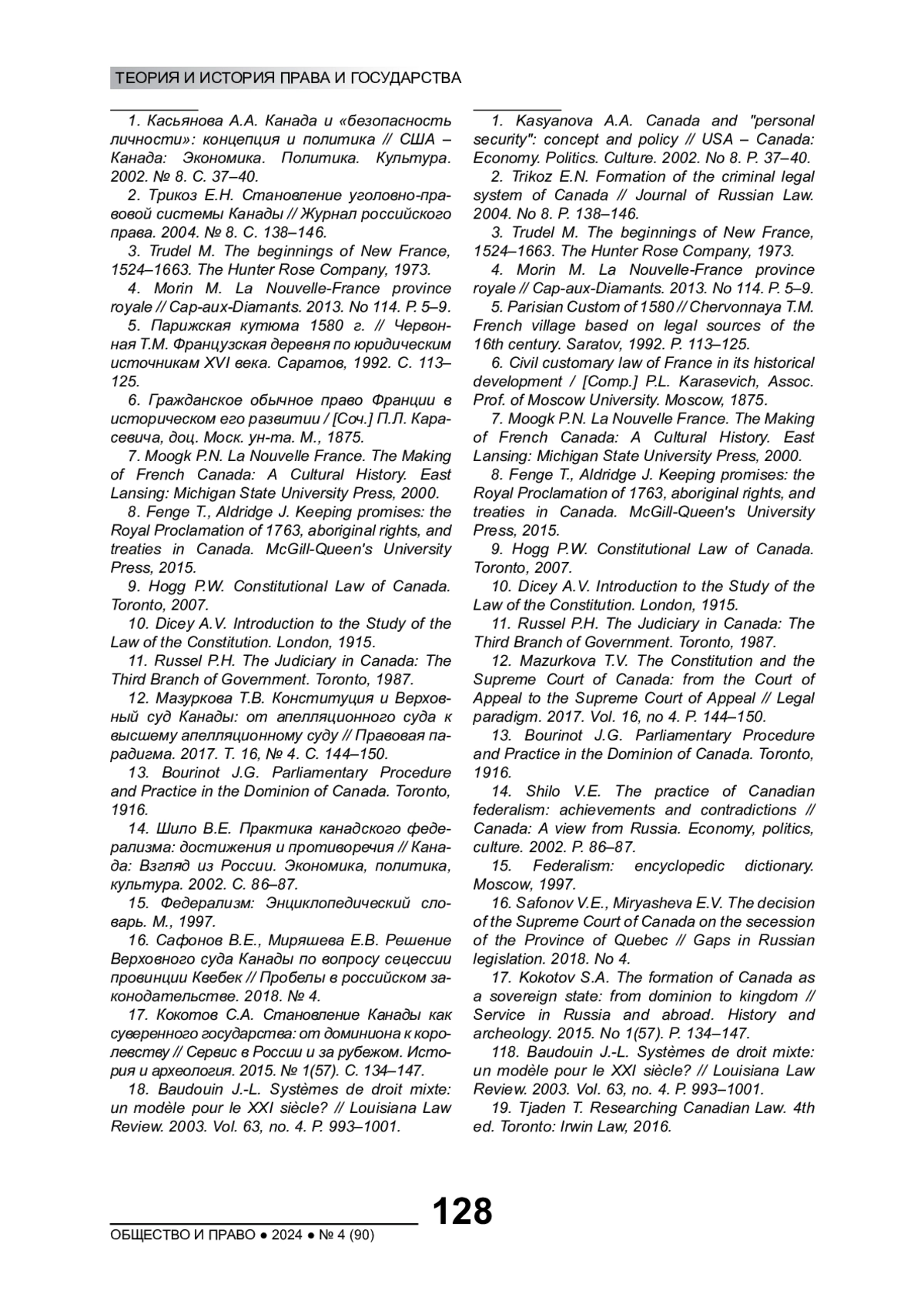 1. Касьянова А.А. Канада и “безопасность личности”: концепция и политика // США - Канада: Экономика. Политика. Культура. 2002. № 8. С. 37-40.
