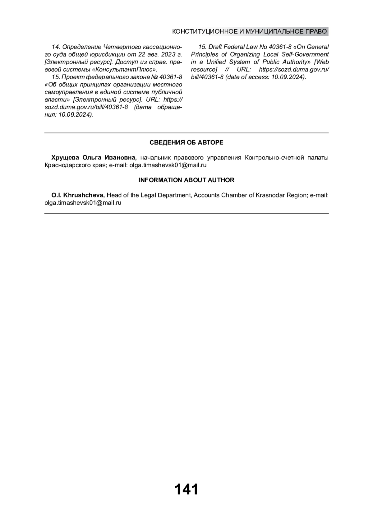 ХРУЩЕВА О. И. О НЕКОТОРЫХ ПРОБЛЕМАХ ПРАВОВОГО РЕГУЛИРОВАНИЯ НАДЕЛЕНИЯ ОРГАНОВ МЕСТНОГО САМОУПРАВЛЕНИЯ ОТДЕЛЬНЫМИ ГОСУДАРСТВЕННЫМИ ПОЛНОМОЧИЯМИ СУБЪЕКТА РОССИЙСКОЙ ФЕДЕРАЦИИ // ОБЩЕСТВО И ПРАВО. 2024. № 4 (90)