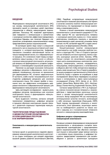 Формирование межкультурной сензитивности (МС) как основы межкультурной компетентности (МК) признается одной из ключевых целей подготовки специалистов в области межкультурного взаимодействия. Поскольку МС позволяет адаптировать свое поведение и коммуникацию в соответствии с культурным контекстом, эффективно преодолевать культурные барьеры, она помогает будущим специалистам устанавливать взаимопонимание между представителями разных национальностей.