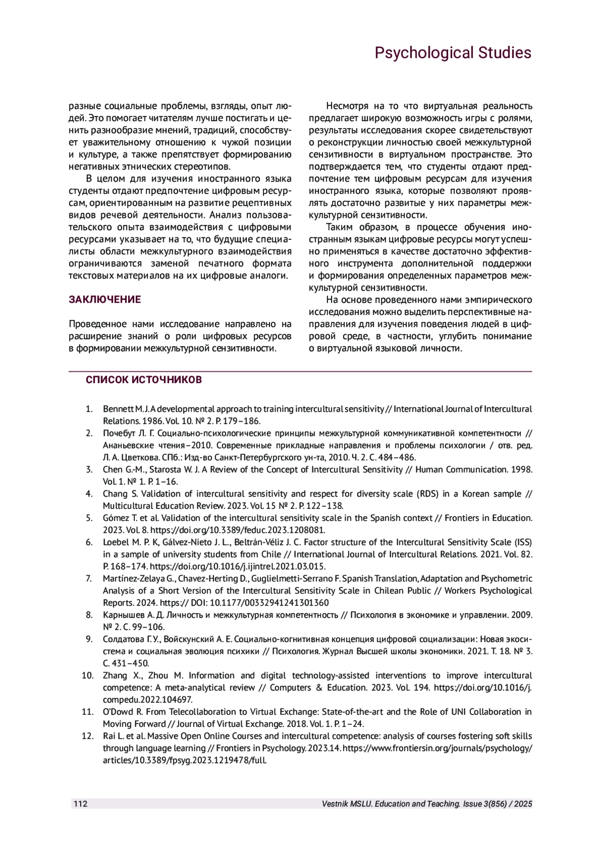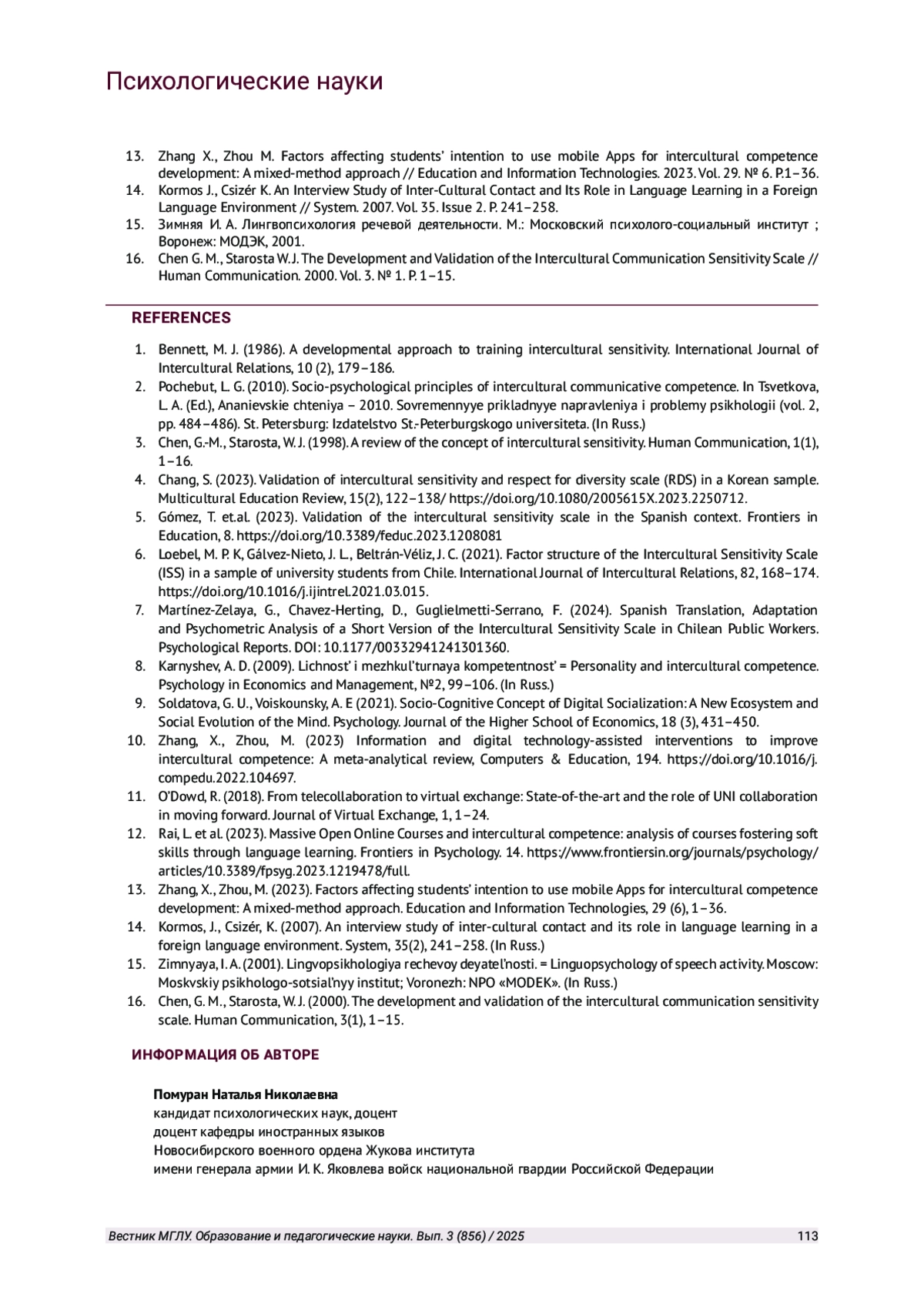 5. Gómez T. et al. Validation of the intercultural sensitivity scale in the Spanish context // Frontiers in Education. 2023. Vol. 8. DOI: 10.3389/feduc.2023.1208081 EDN: ATNNBE
