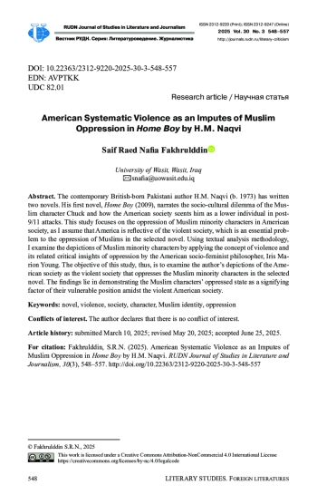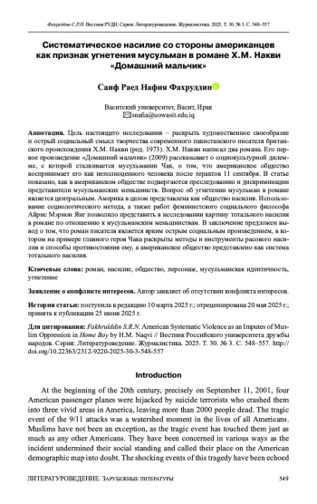 Цель настоящего исследования – раскрыть художественное своеобразие и острый социальный смысл творчества современного пакистанского писателя британского происхождения Х. М. Накви (род. 1973). Х. М. Накви написал два романа. Его пер вое произведение «Домашний мальчик» (2009) рассказывает о социокультурной дилемме, с которой сталкивается мусульманин Чак, о том, что американское общество воспринимает его как неполноценного человека после терактов 11 сентября. В статье показано, как в американском обществе подвергаются преследованию и дискриминации представители мусульманских меньшинств. Вопрос об угнетении мусульман в романе является центральным. Америка в целом представлена как общество насилия. Использование социологического метода, а также работ феминистского социального философа Айрис Мэрион Янг позволило представить в исследовании картину тотального насилия в романе по отношению к мусульманским меньшинствам. В заключение предложен вы вод о том, что роман писателя является ярким острым социальным произведением, в котором на примере главного героя Чака раскрыты методы и инструменты расового насилия и способы противостояния ему, а американское общество представлено как система тотального насилия.